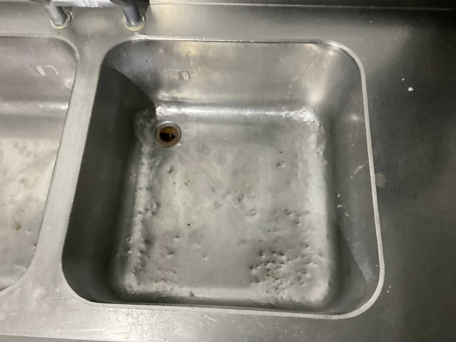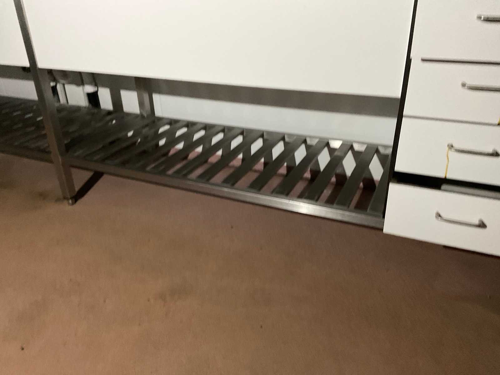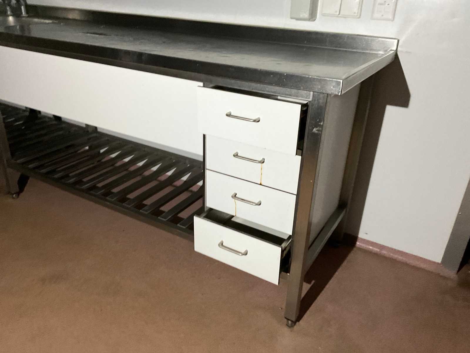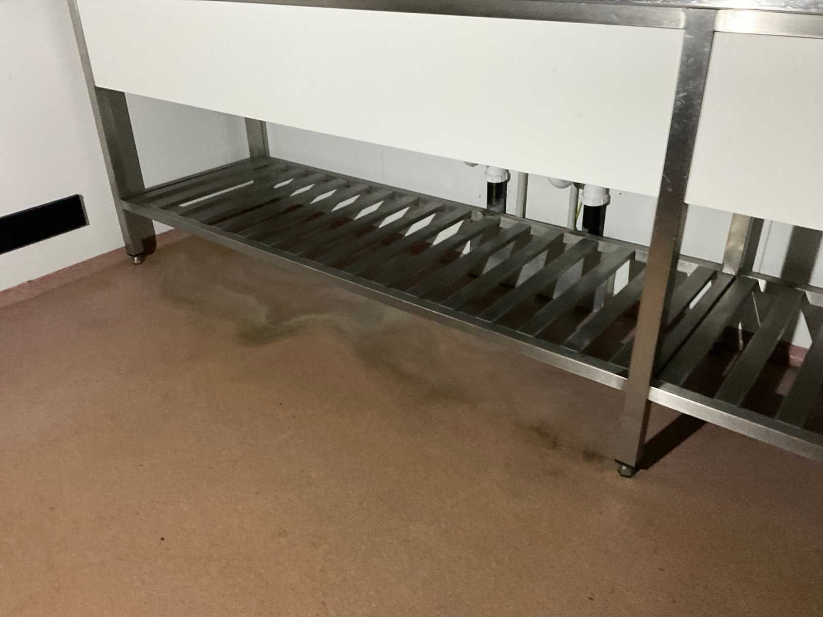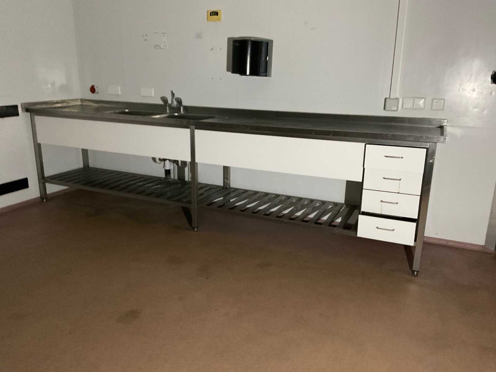 Voorzien van: dubbele wasbak 500x500x250mm; Demontage en transport volledig voor rekening en risico van koper; Totale afmeting L: 3500mm Totale afmeting Breedte: 700mm Totale afmeting Hoogte: 910mm