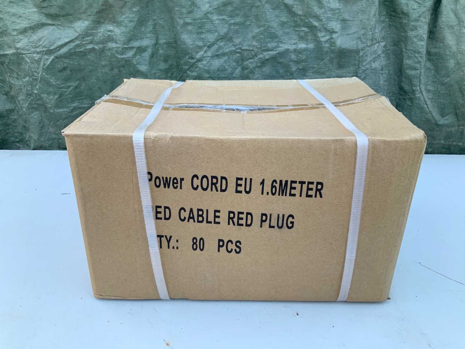 Doos met 80 stuks aansluitsnoer, dikte kabel 3x1,5 mm2 met geaarde stekker. Gewicht: 18kg Lengte: 160cm