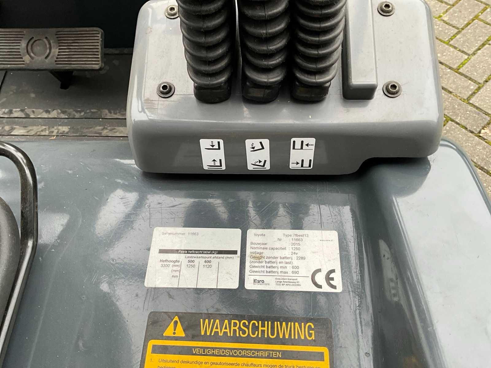 Wordt uitgeleverd met acculader, voorzien van 3 hydraulische functies (heffen/neigen/side-shift), Merk: Toyota Type: 7FBEST13 Bouwjaar: 2015 Serienummer: 11663 Brandstof: Elektrisch Mast: Duplex Soort band: Volrubber banden Aantal wielen: 3 Afgelezen urenstand: 13437 Accu lader: true Side-shift: true Duplex mast: true Hefvermogen: 1250kg Lepellengte: 1150mm Hefhoogte: 3300mm Vol rubber banden: true Minimale doorrijhoogte: 2200mm Totale afmeting L: 2900mm Totale afmeting Breedte: 1150mm Totale afmeting Hoogte: 2200mm