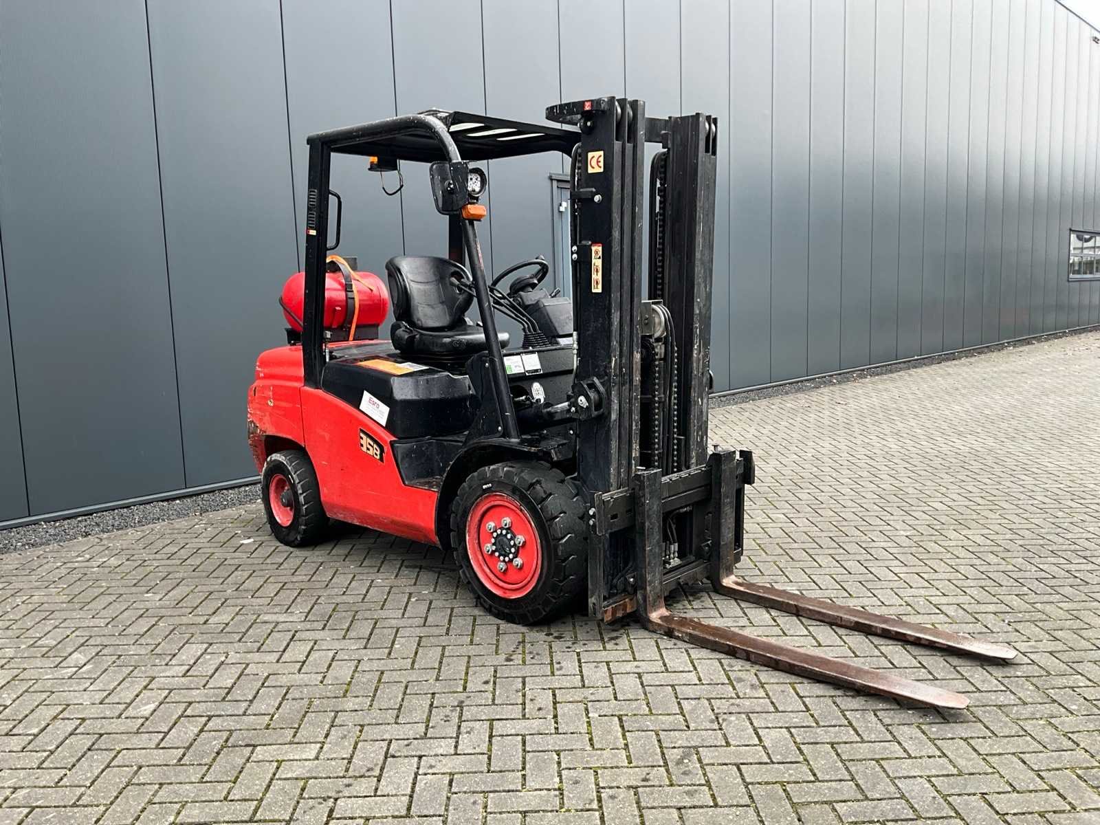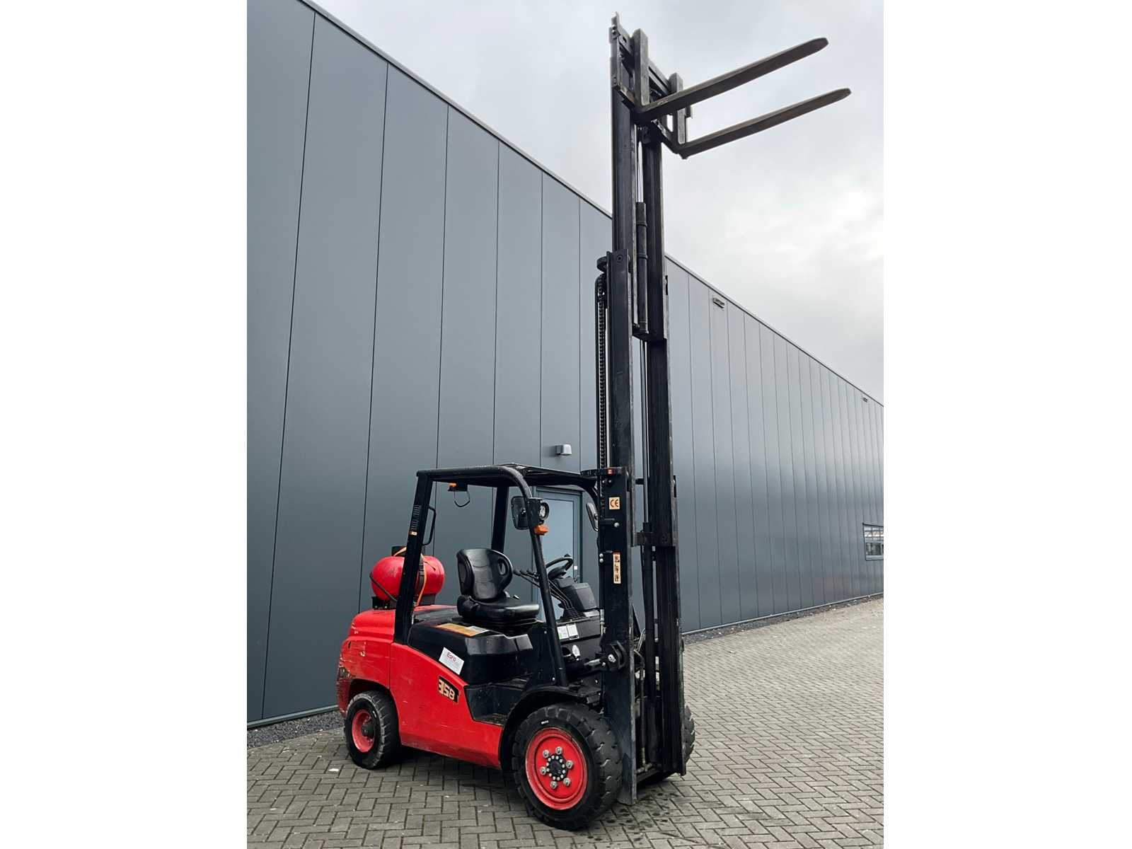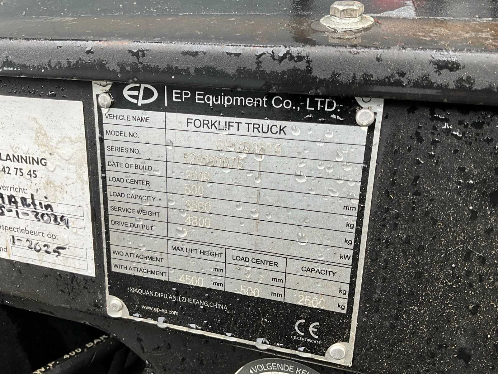 Merk: EP Equipment Type: CP0D35T8 Bouwjaar: 2019 Serienummer: 528100075 Brandstof: LPG Mast: Triple Soort band: Volrubber banden Aantal wielen: 4 Afgelezen urenstand: 1343 Free-lift: true Side-shift: true Triple mast: true Eigen gewicht: 4800kg Hefvermogen: 3500kg Lepellengte: 1200mm Hefhoogte: 4500mm Vol rubber banden: true Minimale doorrijhoogte: 2200mm Totale afmeting L: 4000mm