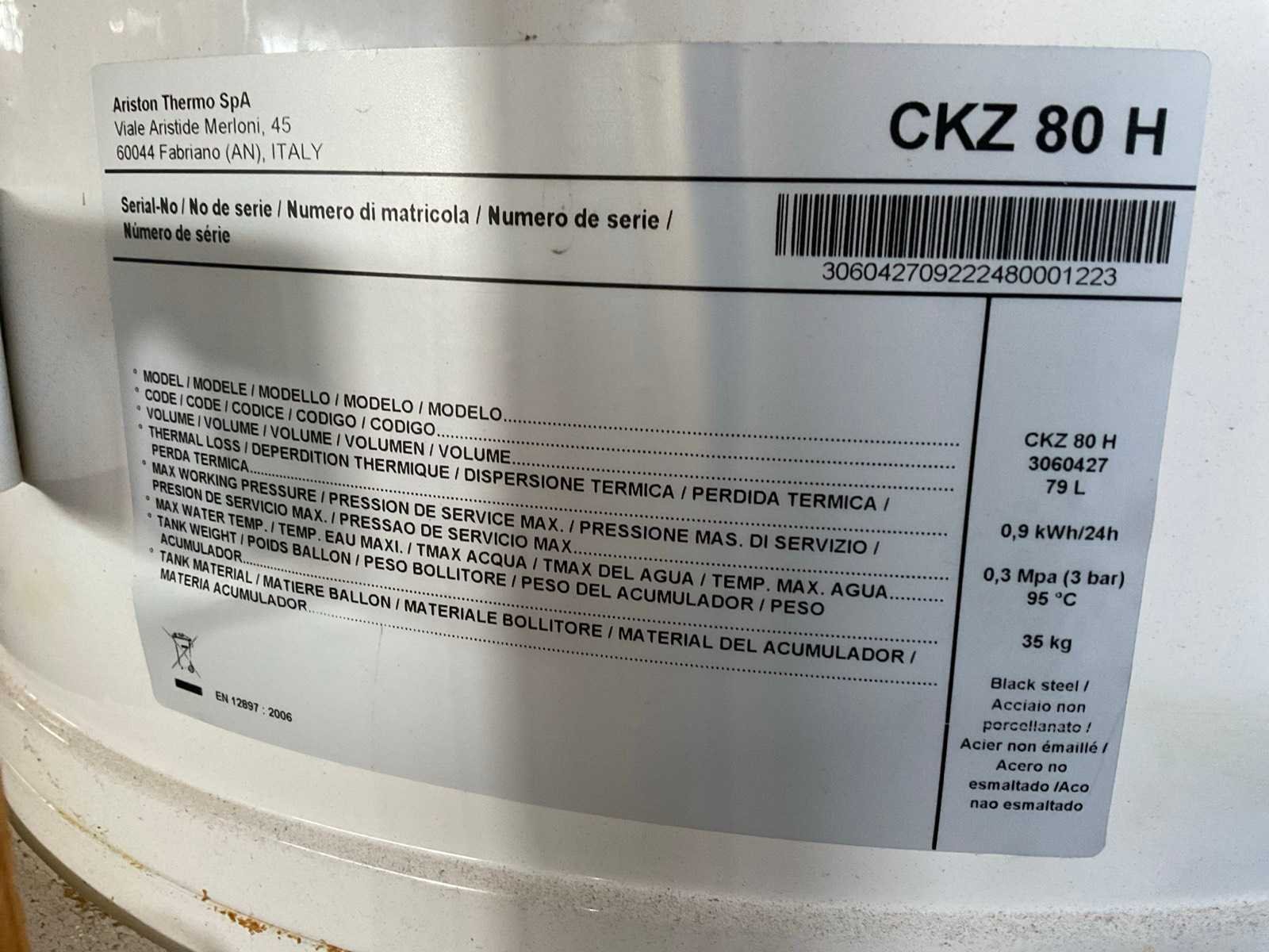 Inhoud: 79L. Ongebruikt Merk: Ariston Type: CKZ 80 H Bouwjaar: 2006 Serienummer: 3060427 Vermogen: 900W Eigen gewicht: 35kg Totale afmeting L: 600mm Totale afmeting Breedte: 600mm Totale afmeting Hoogte: 800mm