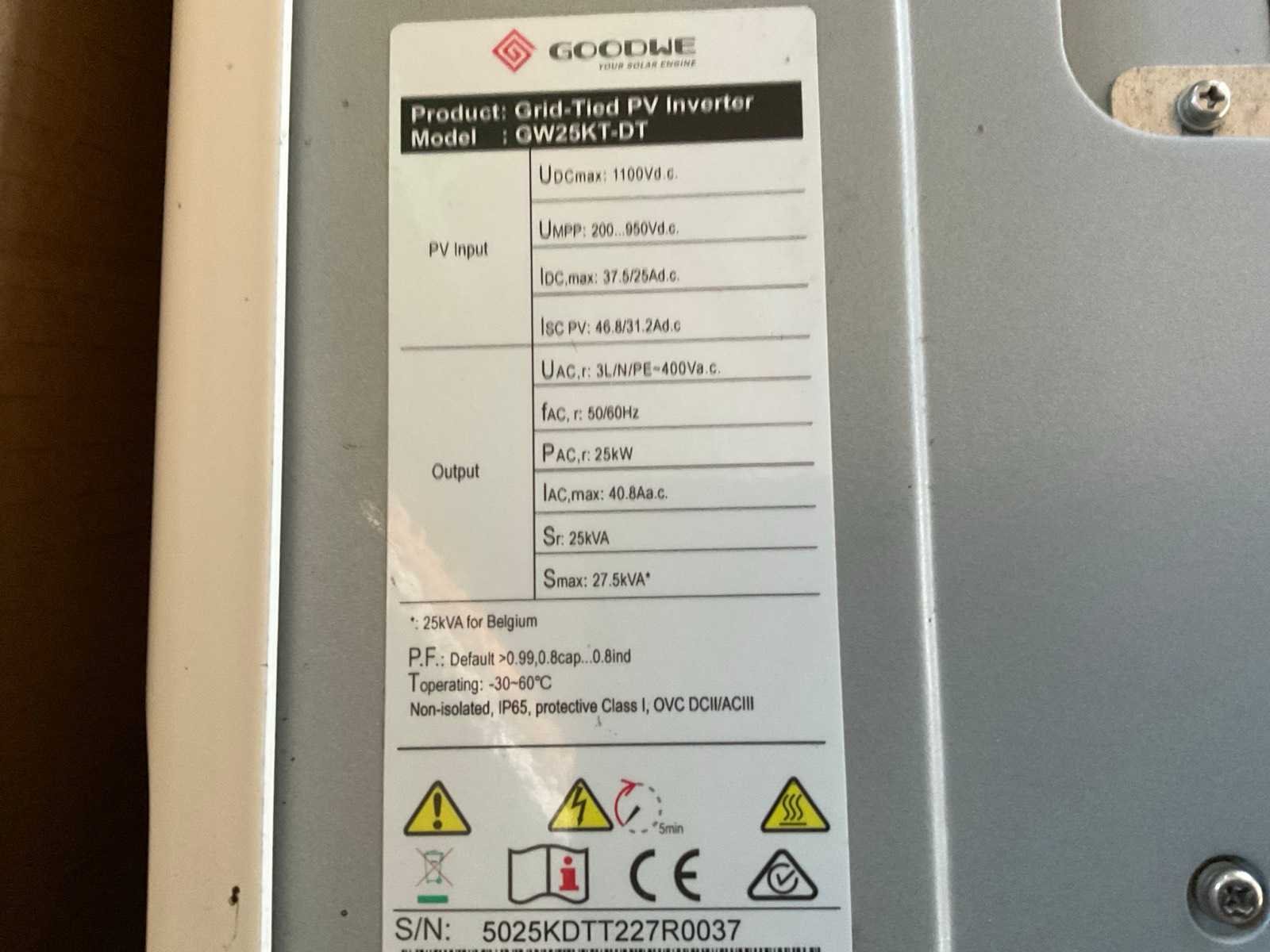 Inclusief Goodwe type GW25KT-DT omvormer Merk: JA Solar Type: JAM54D40-445LB Aantal cellen: 108 Max. dc power: 445W Max. dc voltage: 39.1V Totale afmeting L: 1760mm Totale afmeting Breedte: 1130mm