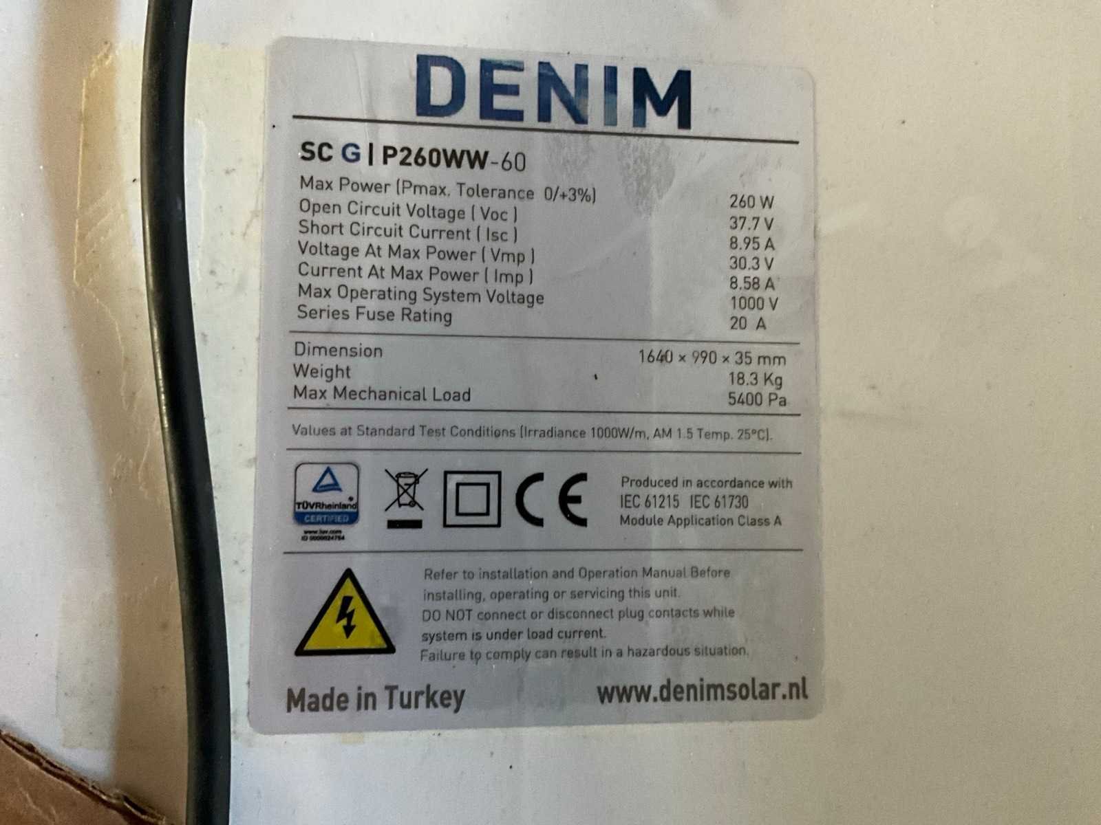 Merk: Denim Type: SC G P260WW-60 Max. dc power: 260W Max. dc voltage: 303V Totale afmeting L: 1640mm Totale afmeting Breedte: 990mm
