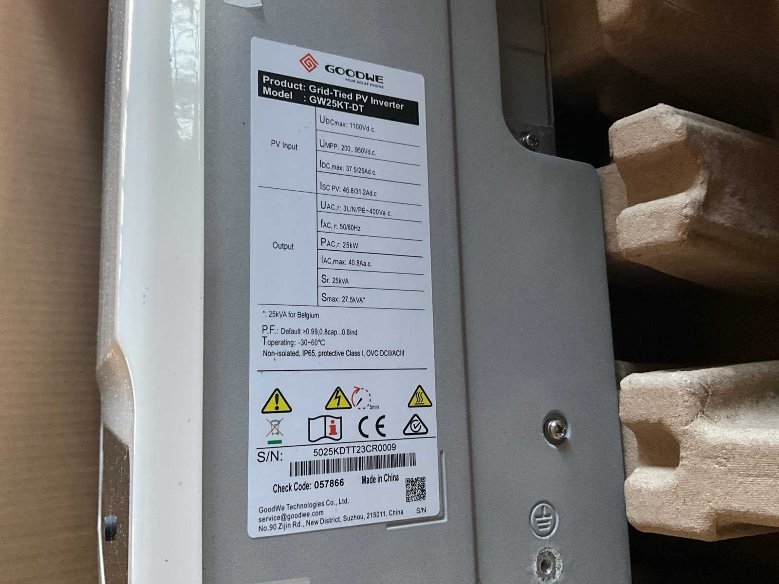 Inclusief Goodwe GW25K-SDT-30 omvormer. Merk: Longi Type: 72HPH-455M Max. dc power: 450W Totale afmeting L: 2100mm Totale afmeting Breedte: 1040mm