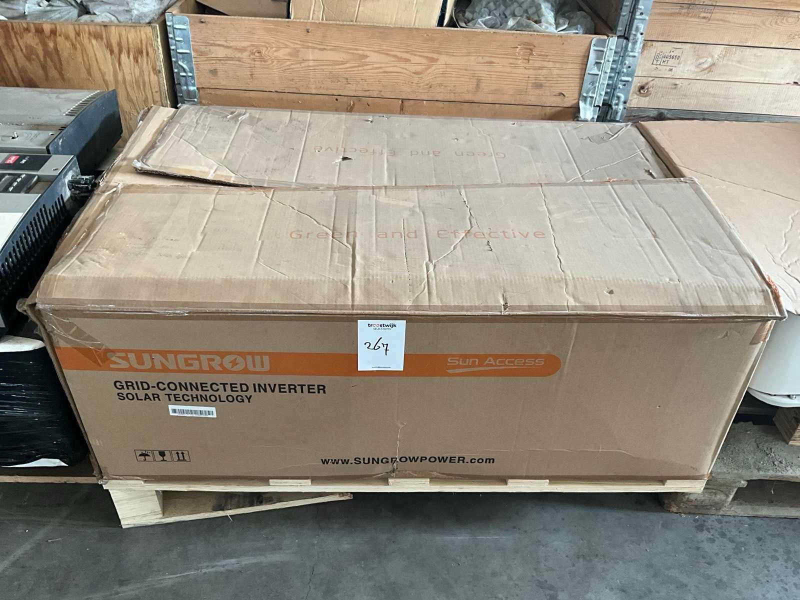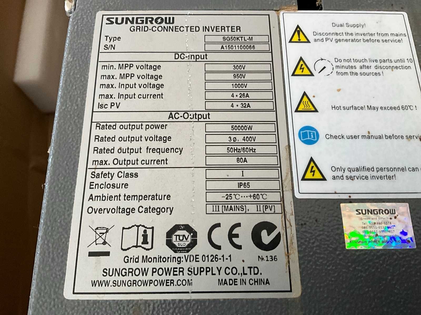 Inclusief montagemateriaal. Merk: Sungrow Type: Sun Acces SG50KTL-M Serienummer: A1501100066 Totale afmeting L: 260mm Totale afmeting Breedte: 660mm Totale afmeting Hoogte: 960mm