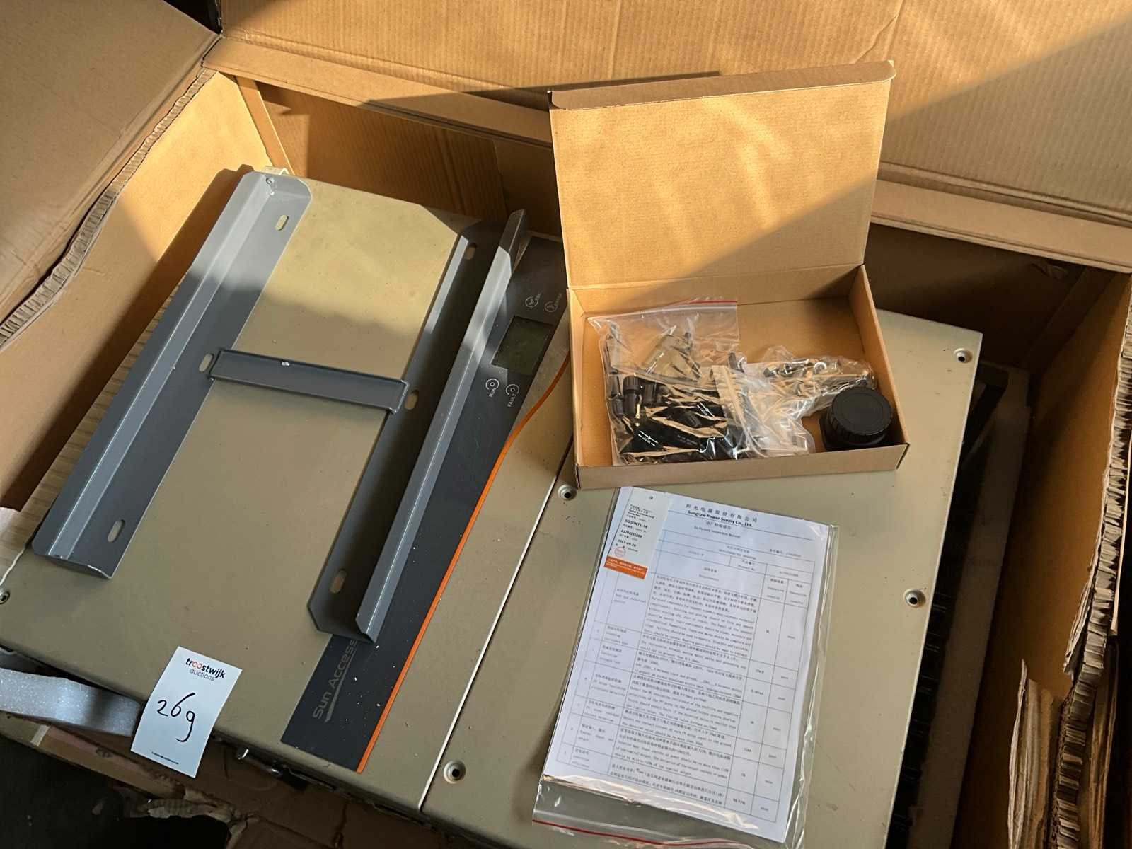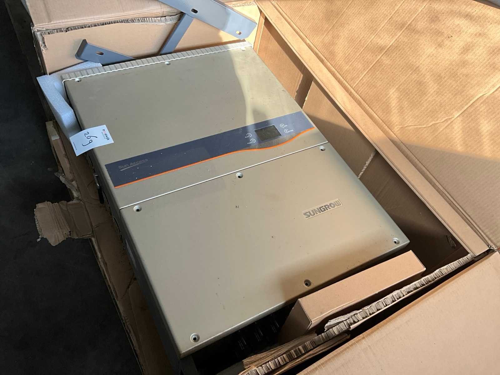 Inclusief montagemateriaal. Merk: Sungrow Type: Sun Acces SG50KTL-M Serienummer: A1501100090 Totale afmeting L: 260mm Totale afmeting Breedte: 660mm Totale afmeting Hoogte: 960mm