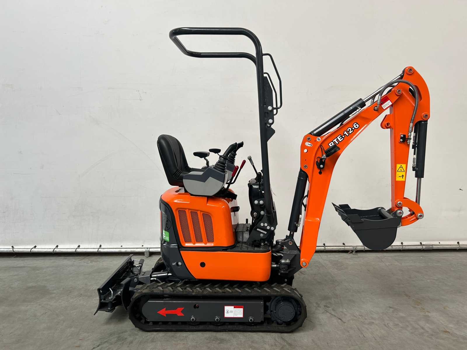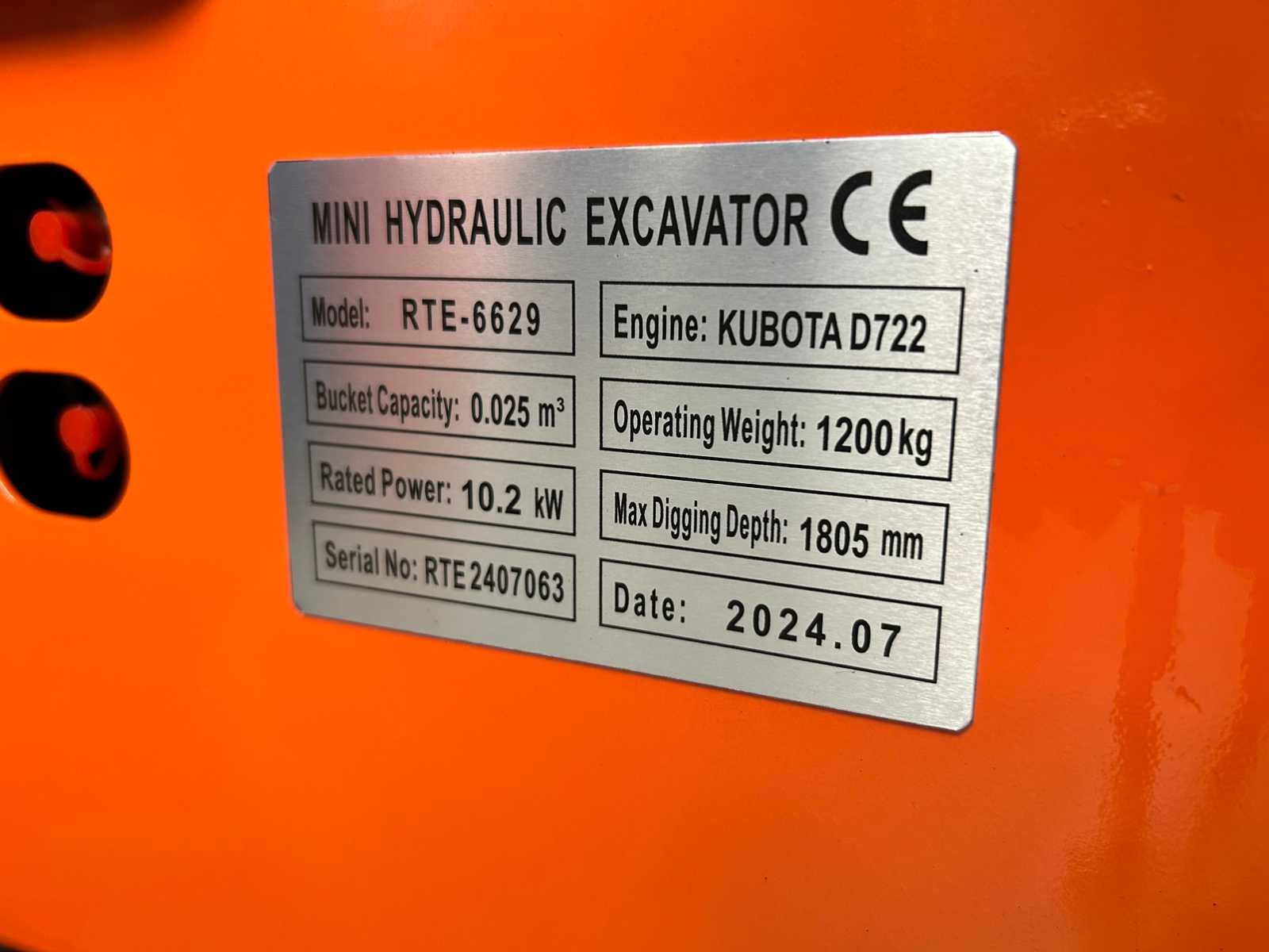 Ongebruikt; zwenkarm; motor Kubota D722 EURO5; bucket capaciteit 0,025m3; v.v. verlichting; 6629 Merk: RTE Type: CRE120 Bouwjaar: 2025 Merk motor: Kubota Motorvermogen (kW): 10.20kW Aantal cilinders: 3 Brandstof: Diesel Max. graafdiepte: 1805mm Inclusief graafbak: Yes Graafbak afm. l: 380mm Graafbak afm. b: 225mm Graafbak afm. h: 310mm Rups breedte: 180mm Eigen gewicht: 1200kg Totale afmeting L: 2300mm Totale afmeting Breedte: 820mm Totale afmeting Hoogte: 2200mm