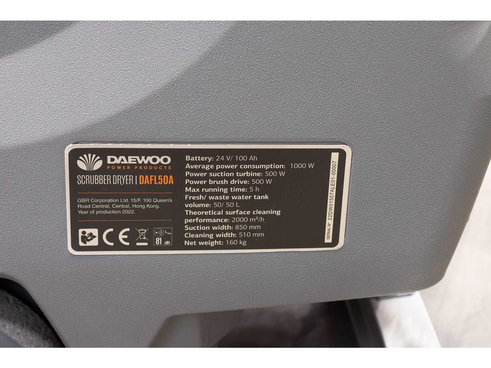 Ongebruikt in doos; met acculader; met handleiding; maximale werktijd 5 uur; 175 rpm borstelsnelheid; 24 liter per seconde zuigkracht; 2000 m2 per uur theoretische oppervlakteprestatie; geschikt voor vloerhelling tot 2 graden; 2 * 50 liter reservoir inhoud; maximale watertemperatuur van 60 graden Celsius; 3769; Merk: Daewoo Type: DAFL50A Bouwjaar: 2025 Werkbreedte: 510mm Kilometerstand bij opname: 0hr Tellerstand niet afleesbaar: true Elektrisch: true Aansluiting: 24V Accu lader: true Oplaadbaar: true Eigen gewicht: 160kg Totale afmeting L: 1250mm Totale afmeting Breedte: 880mm Totale afmeting Hoogte: 1050mm