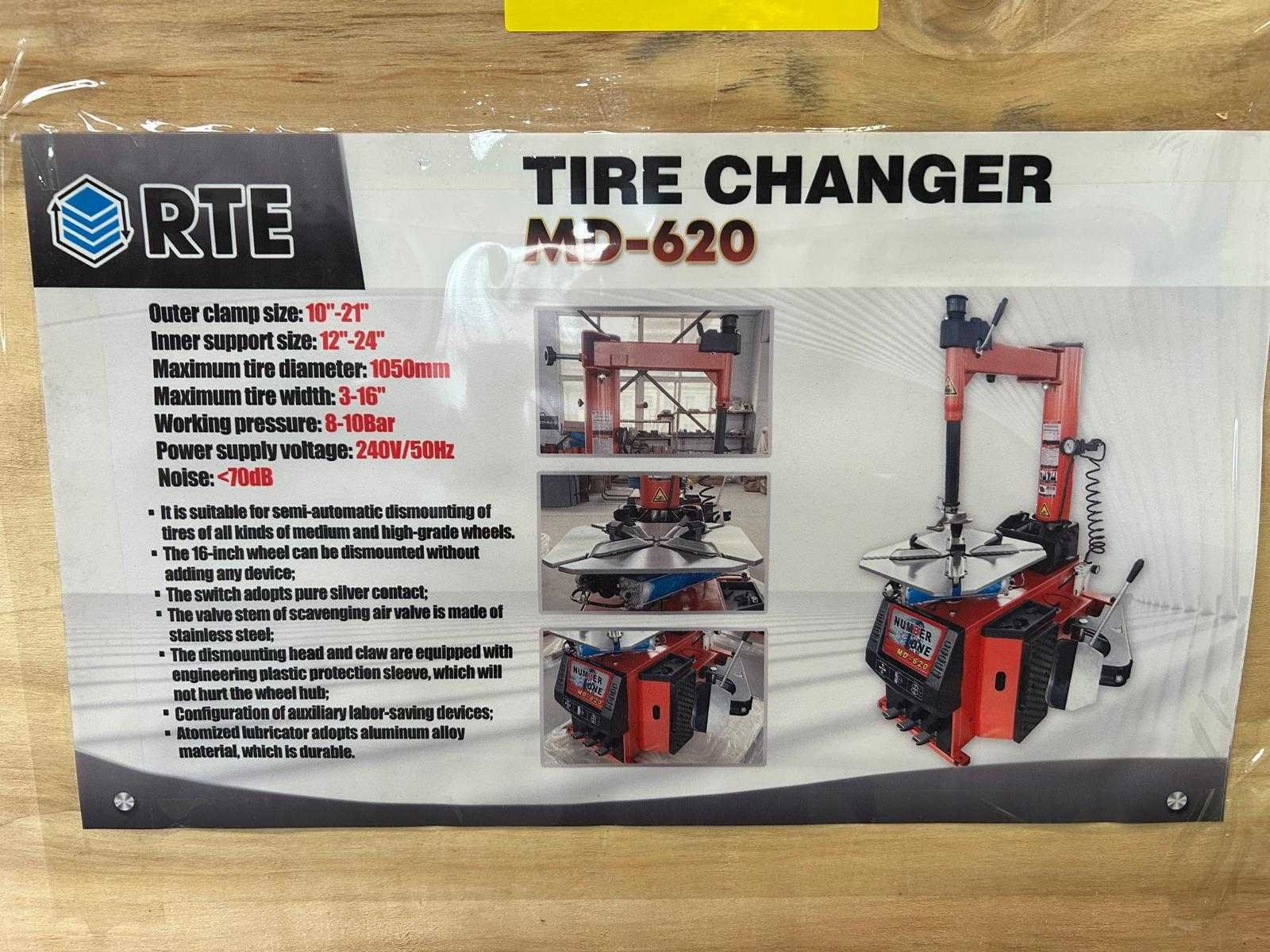 Ongebruikt; in transportkrat; outerclamp 10'' till 21''; inner support size 12'' till 24''; maximum tire diameter 1050mm; maximum tire width 3'' till 16''; working pressure 8-10 Bar; bouwpakket; 8122 Merk: RTE Type: MD-620 Bouwjaar: 2025 Aansluiting: 230V