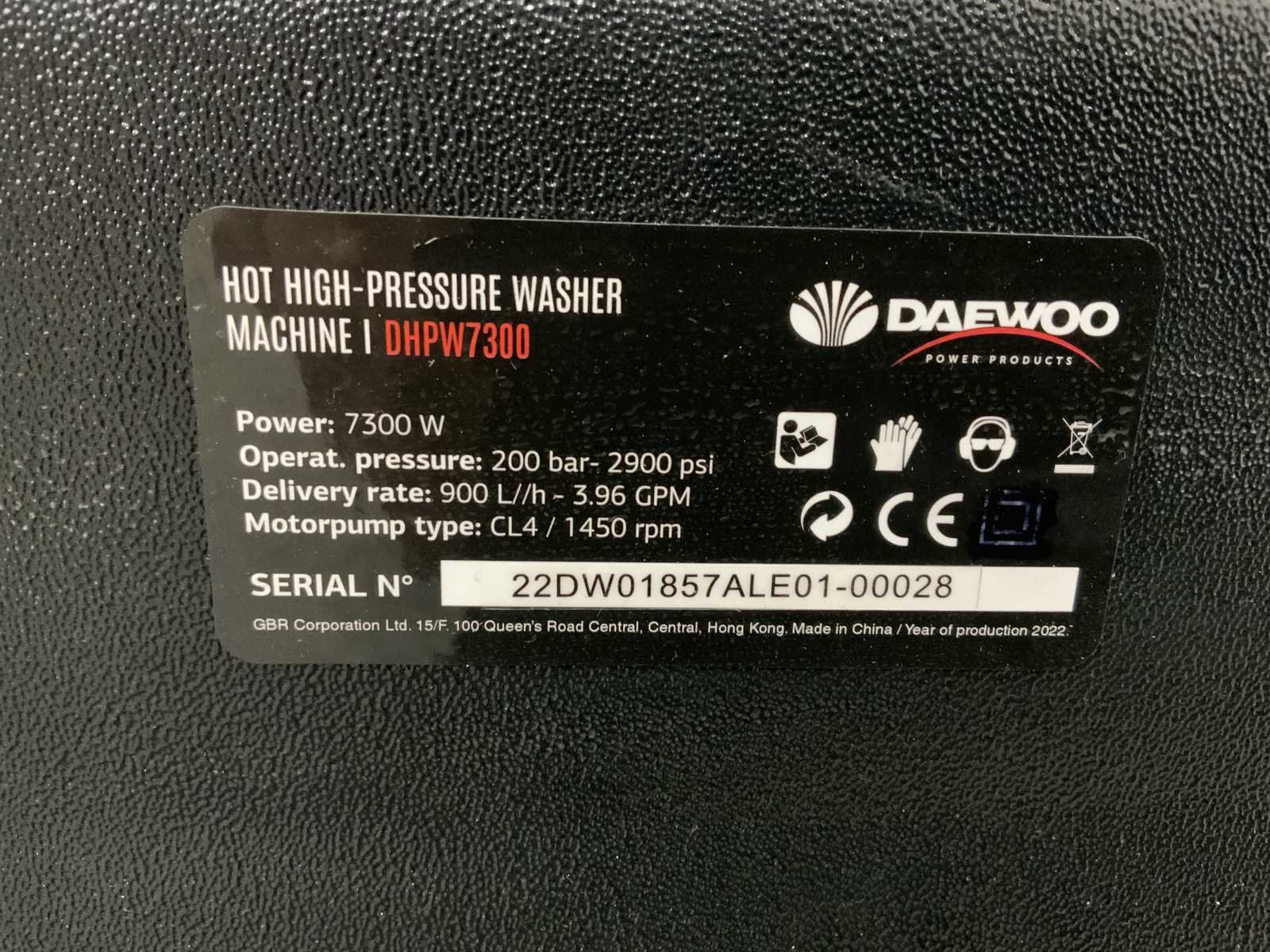 Temperatuurbereik max.: 140 °c; capaciteit: 900 l/hr; dieselgestookt: ja; vermogen: 7,3 kW; aansluiting: 400 V; ongebruikt in houten kist; 4496; Merk: Daewoo Type: DHWP7300 Bouwjaar: 2025 Max. druk: 210bar Gewicht: 128kg Lengte: 1150cm Breedte: 620cm Hoogte: 850cm