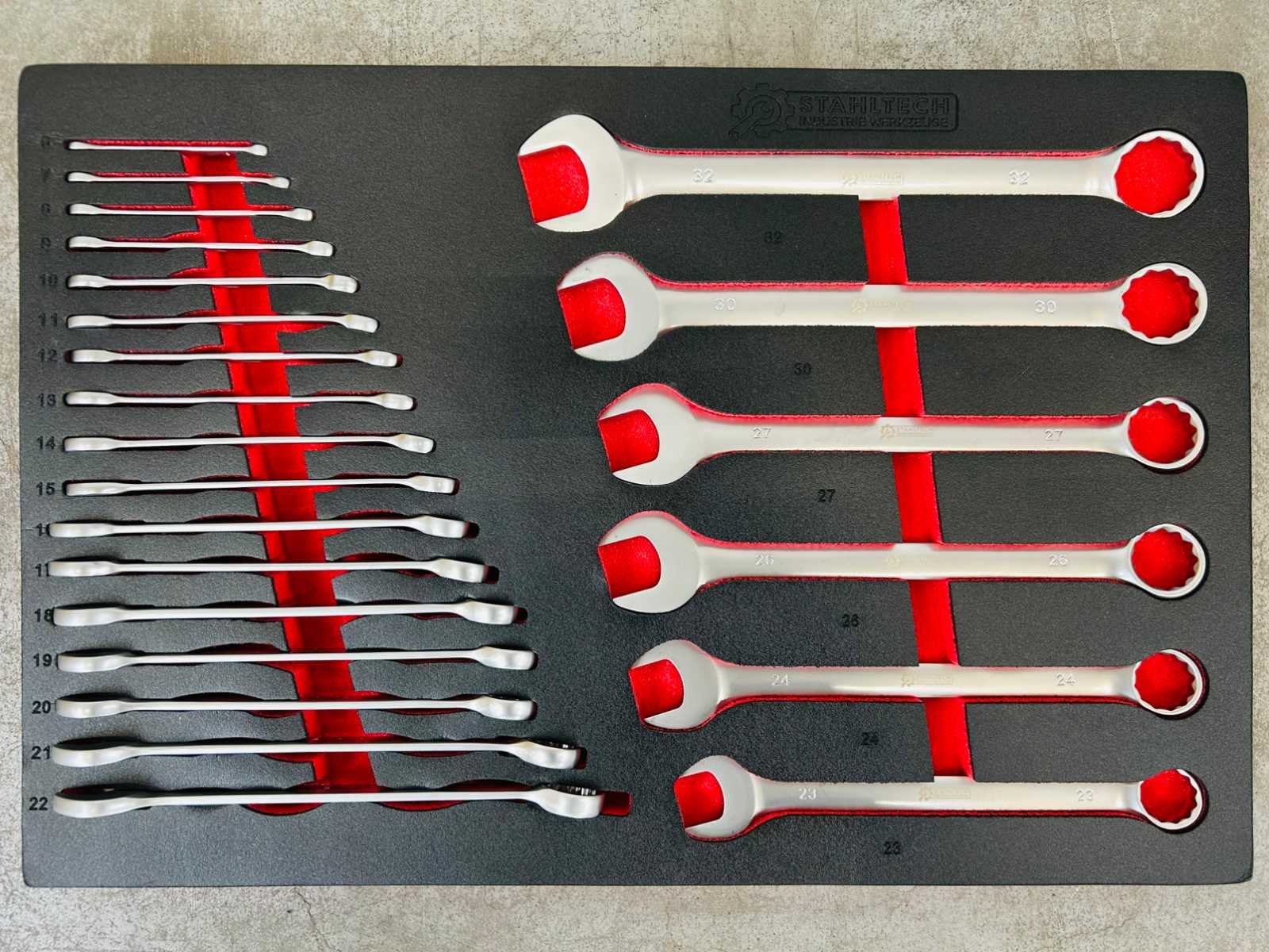 Ongebruikt; gereedschap in plastic verpakt; 12-delig tangenset; 13-delig hamerset; 14-delig meetset; 36-delig slagmoersleutel set; 21-delig sleutels met T-greep; 41-delig schroevendraaierset; 29-delig combinatiesleutels; 12-delig ringsleutels; 125-delig doppenset; 84-delig bitjes set; 7483 Merk: Stahltech Type: 387-delig Lengte: 148cm Breedte: 52cm Hoogte: 110cm