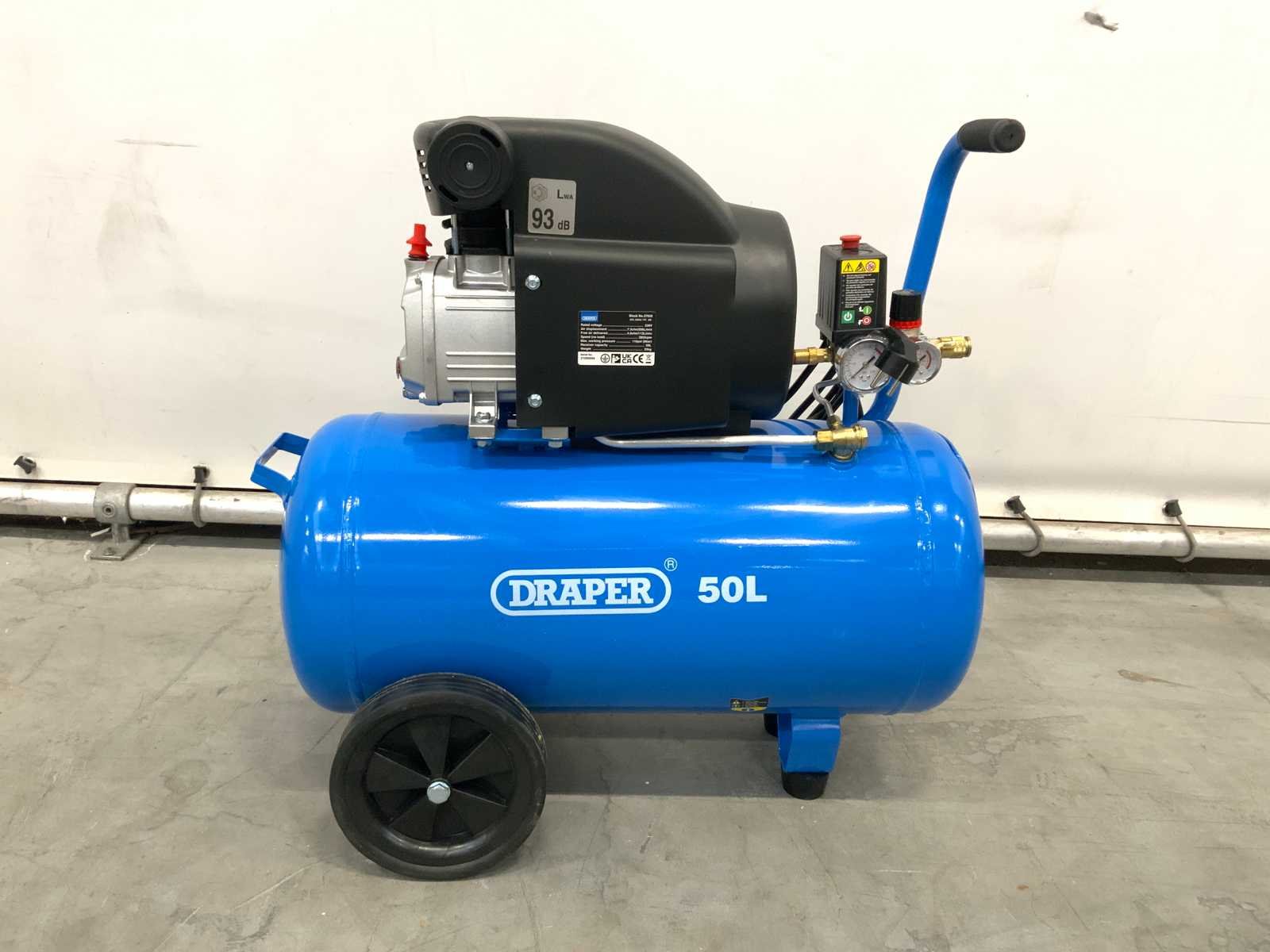 Kan een lichtelijke olielek hebben; 7340 Merk: Draper Type: 50L Mobiel: true Capaciteit.: 8bar Afgelezen urenstand: 0hr Aansluiting: 230V Eigen gewicht: 33kg Totale afmeting L: 770mm Totale afmeting Breedte: 330mm Totale afmeting Hoogte: 740mm