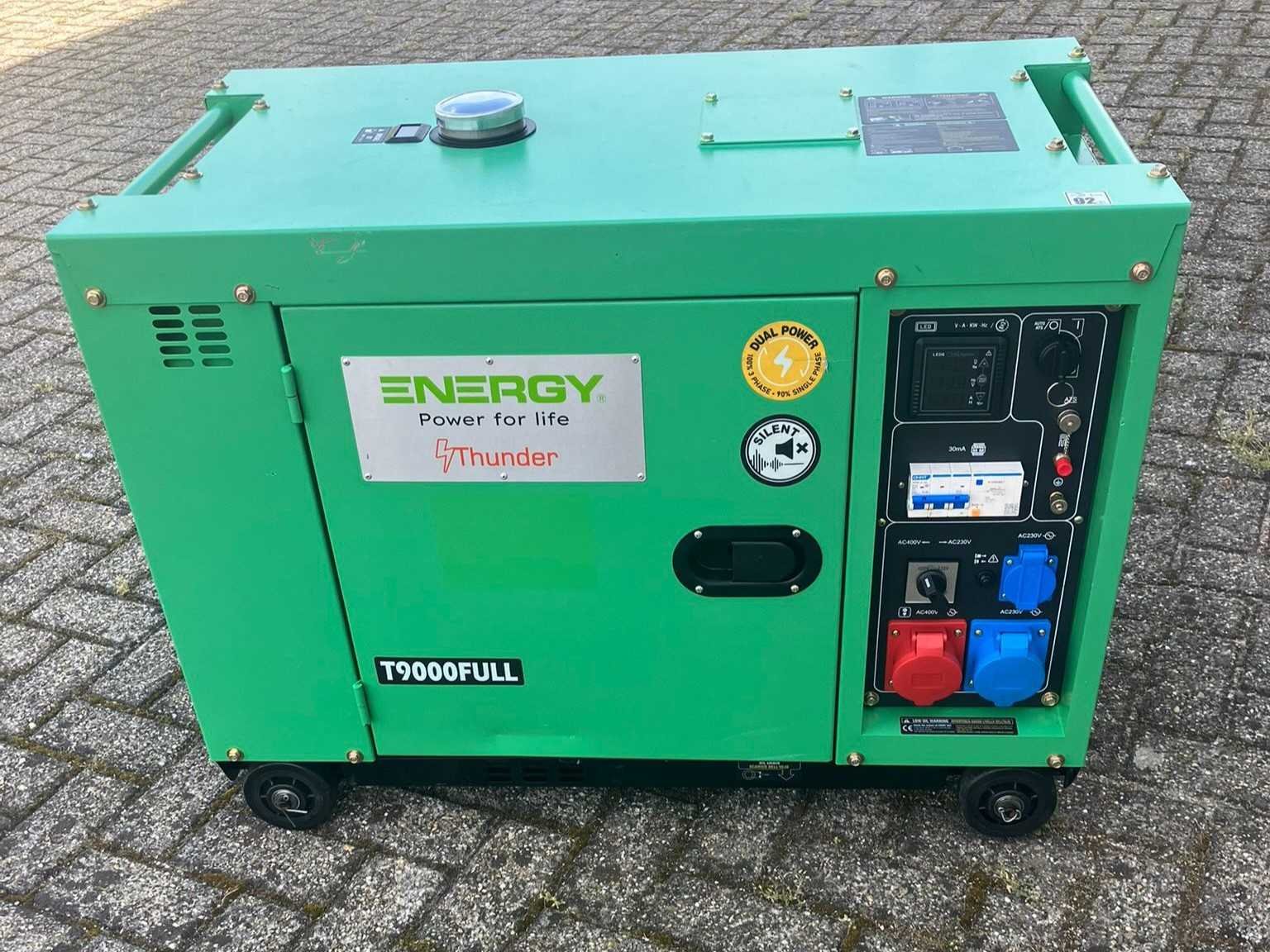 Merk: Het product is gefabriceerd door ENERGY SRL in Italië. Model: Het gaat om het model T9000FULL met serienummer 22X071440; + Technische specificaties: De generator levert een nominaal vermogen van 9 kVA bij 400V en werkt op een spanning van 400/230V. Gewicht: Het netto gewicht van het apparaat is 162 kg. Merk: Energy SRL Type: T9000FULL Serienummer: 22X071440 Capaciteit.: 9kVA Machinegewicht: 170kg