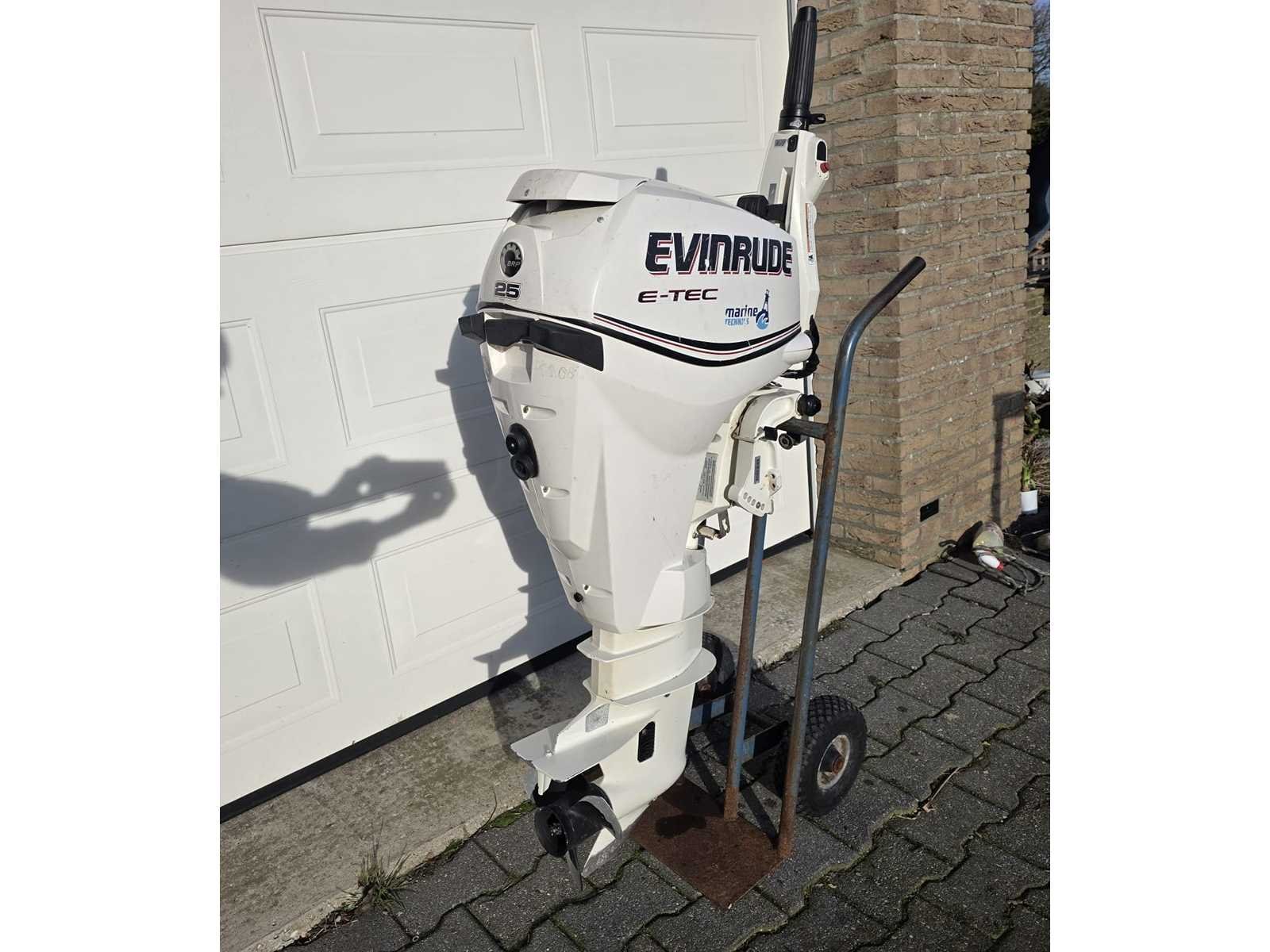 Exclusief transportbok; Evinrude buitenboordmotor, modeljaar 2013, met de volgende specificaties: Model: E25DRSLABA Serienummer: 5375253 Productiedatum: 10/2013 Vermogen: 18.4 kW Massa: 70 kg inclusief brandstoftank 20 liter Merk: Evinrude Model: E-tec Product type: 25 PK Brandstof: benzine Vermogen: 25hp Vermogen (pk): 25hp Lengte: 340cm Breedte: 160cm