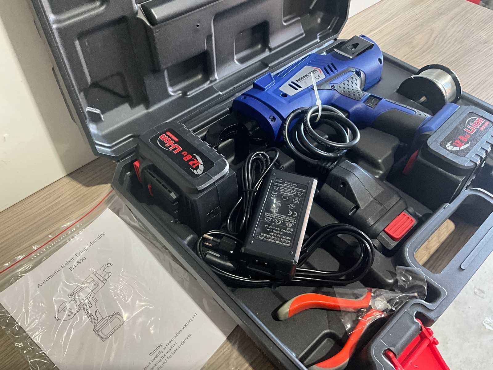 Ongebruikt nieuw in doos / koffer: Nominaal vermogen: 12,8 V Batterijtype: Lithium-ionbatterij Toepasselijk bereik van staalband: 8-34 mm Knoopdraadlengte: 300-500 mm Oplaadtijd batterij: 1,5 uur Batterijcapaciteit: 4400 mAh Batterijduur: 6 uur Gewicht: 3,5 kg Accessoires: batterij 2 stuks, oplader 1 stuks, ijzerdraadtang 1 stuks, draad spoel 1 stuks, inbussleutel 2 stuks, aansluitdraad 1 stuks; handleiding aanwezig Merk: Easy-Going Type: Automatic rebar Tying Bouwjaar: 2025 Model: BT-890 Kleur: Blauw / zwart Accu lader: true Materiaal: Kunststof metaal Met koffer: true Aantal accu's: 2