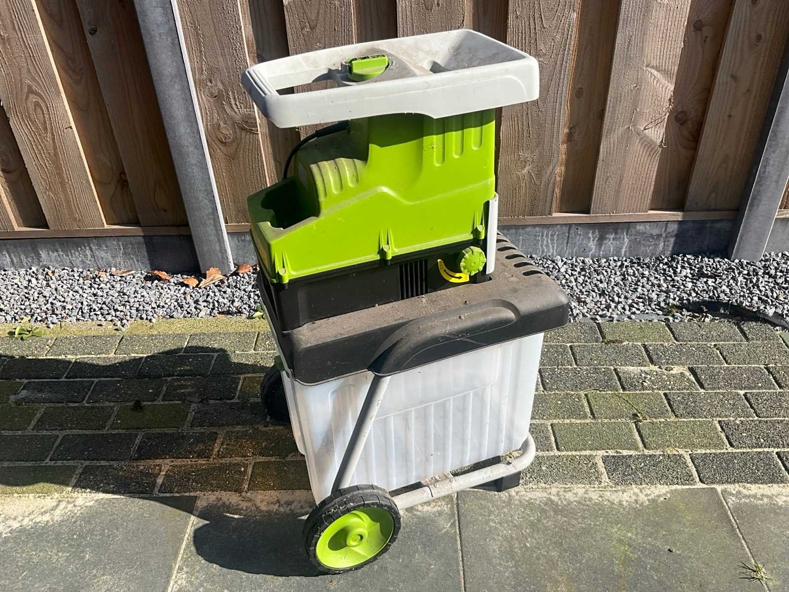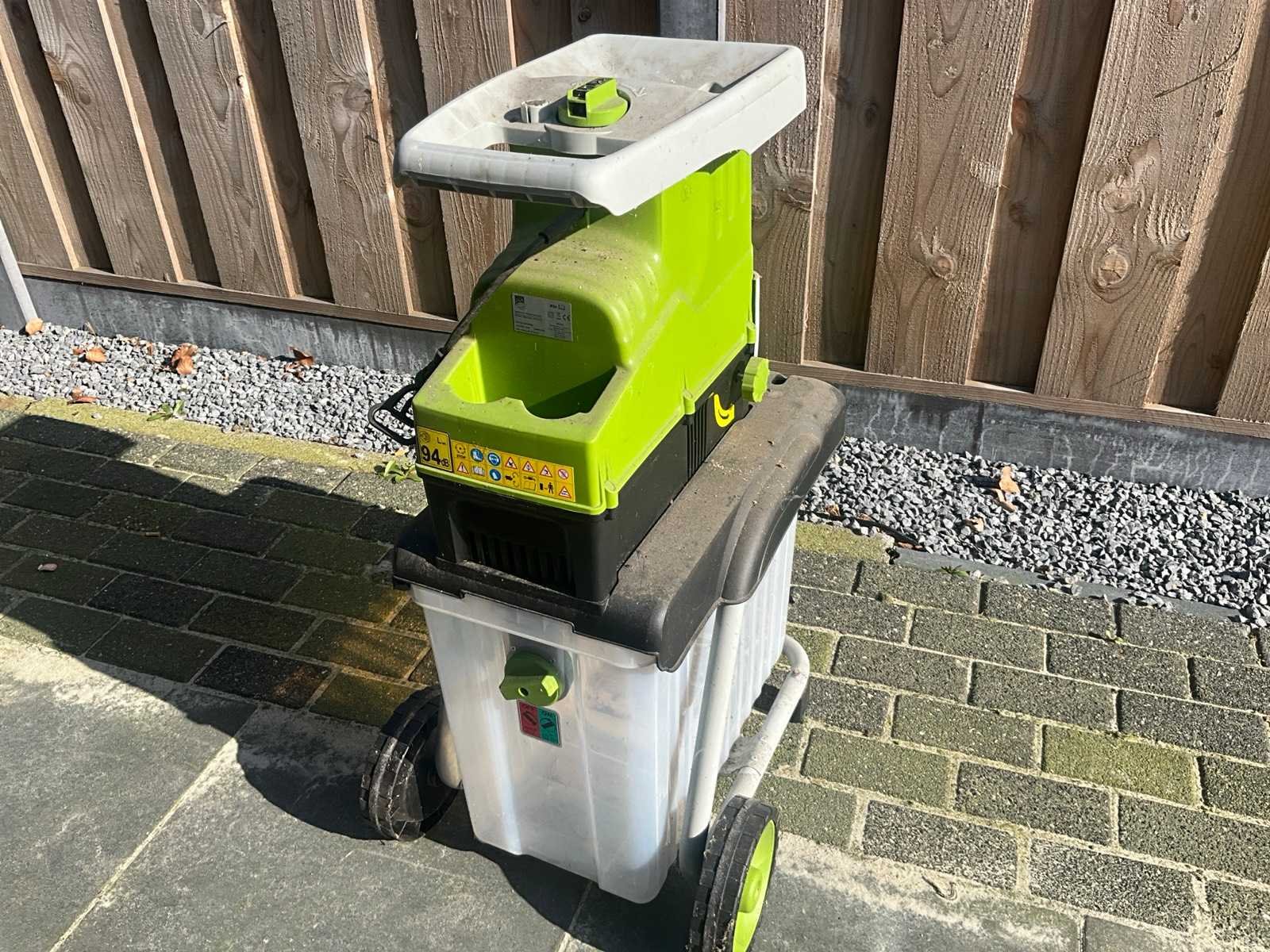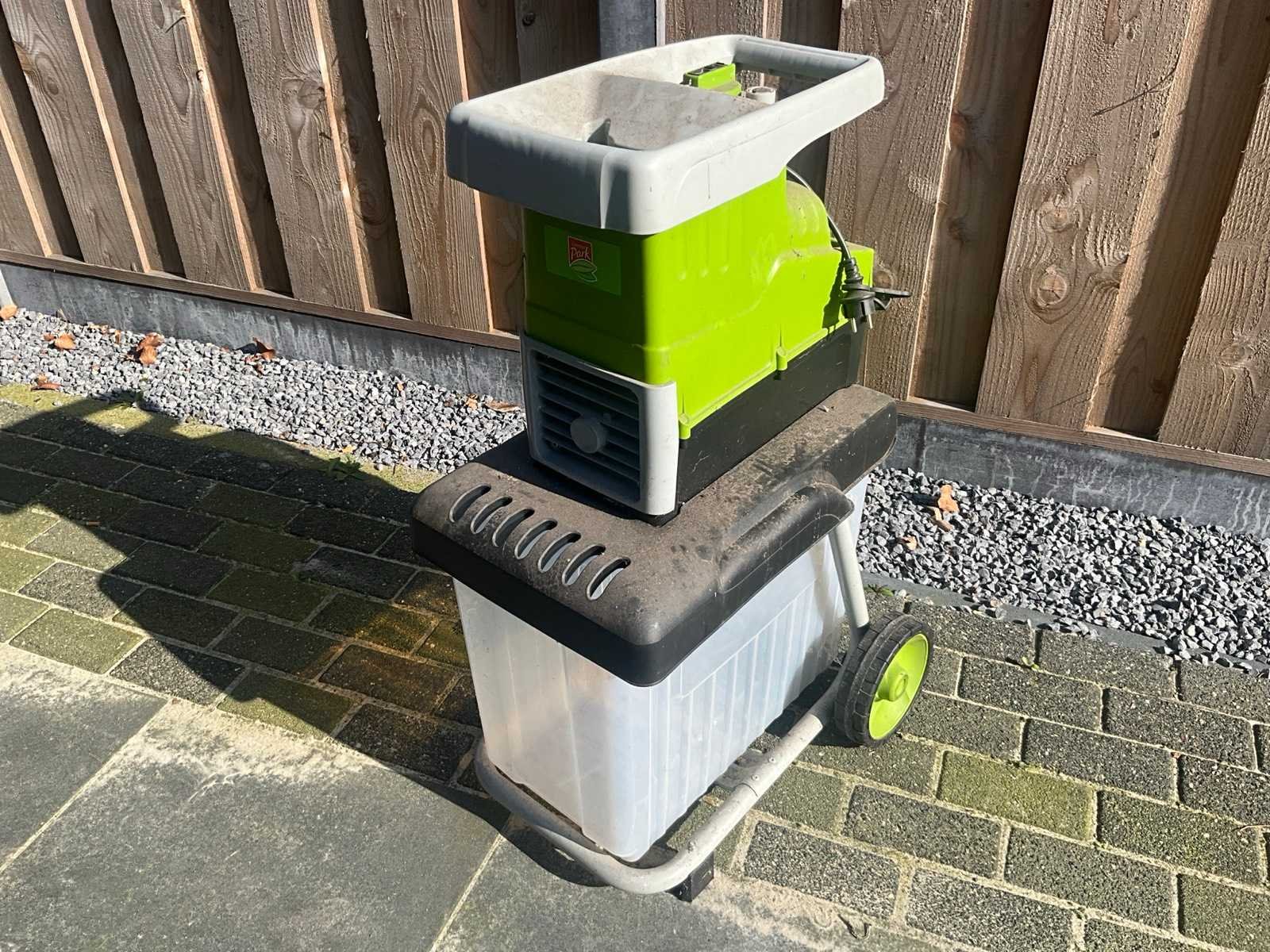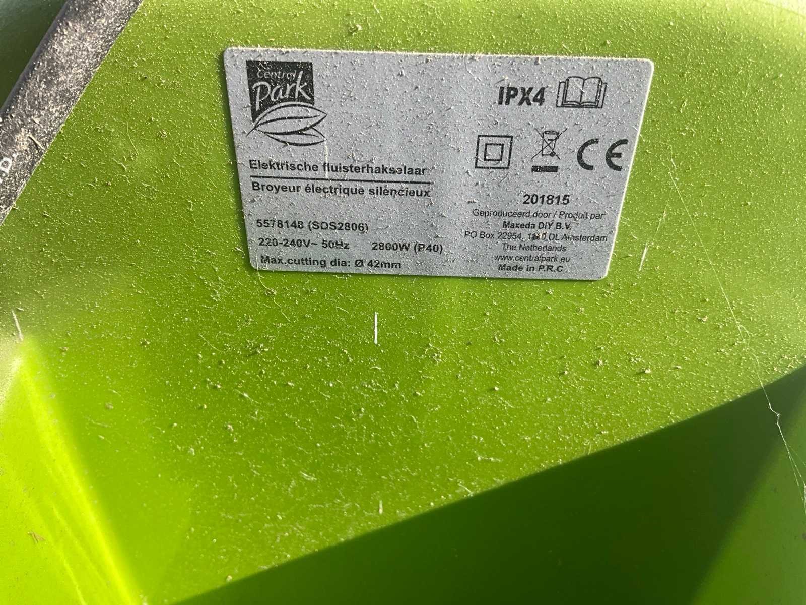 Elektrische fluisterhakselaar van het merk Central Park, model SDS2806. Vermogen: 2800W. Maximale takdiameter 42 mm. Spanning: 220-240V~50Hz. Beschermingsklasse: IPX4 (spatwaterdicht). Merk: Central park Model: SDS2806