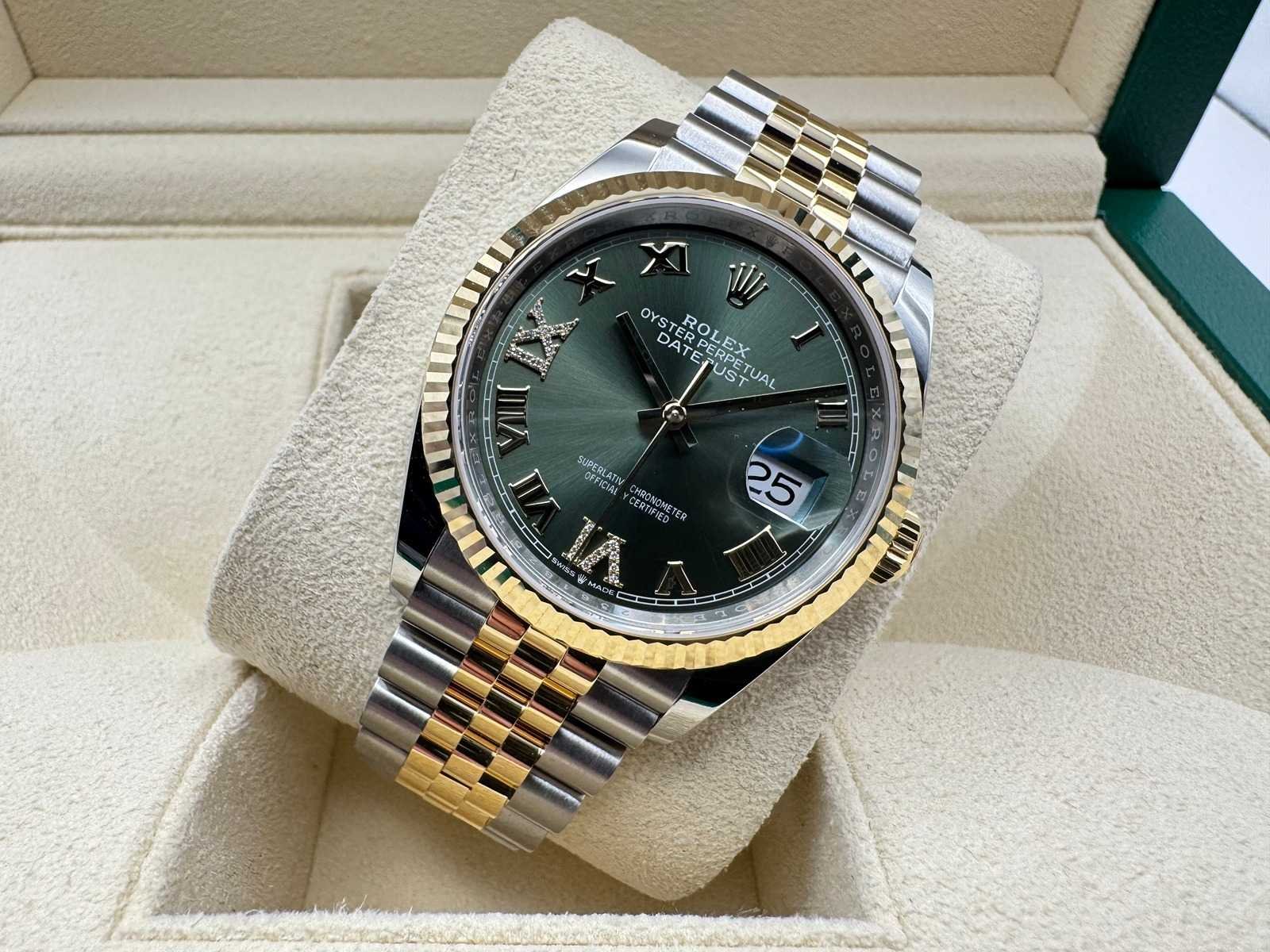 The watch comes as a full set, including the original Rolex box, booklets, warranty card holder, and Rolex guarantee card. 5-year international warranty Key Features: Model: Rolex Datejust 36 Ref. 126233 Condition: Unworn Material: Stainless steel & 18k yellow gold Bracelet: Jubilee Dial: diamonds at 6 and 9 o’clock Bezel: Fluted 18k yellow gold International warranty: 5 years remaining Full set: Includes box, papers, warranty card, and Rolex tag Merk: Rolex Model: Datejust 36 Bouwjaar: 2026 Referentienummer: 126233 Materiaal kast: Steel / yellow gold Materiaal horlogeband: Steel / yellow gold Materiaal sluiting: Steel / yellow gold Wijzerplaat: Olive green with diamonds on the 6&9 Kastmaat: 36 mm