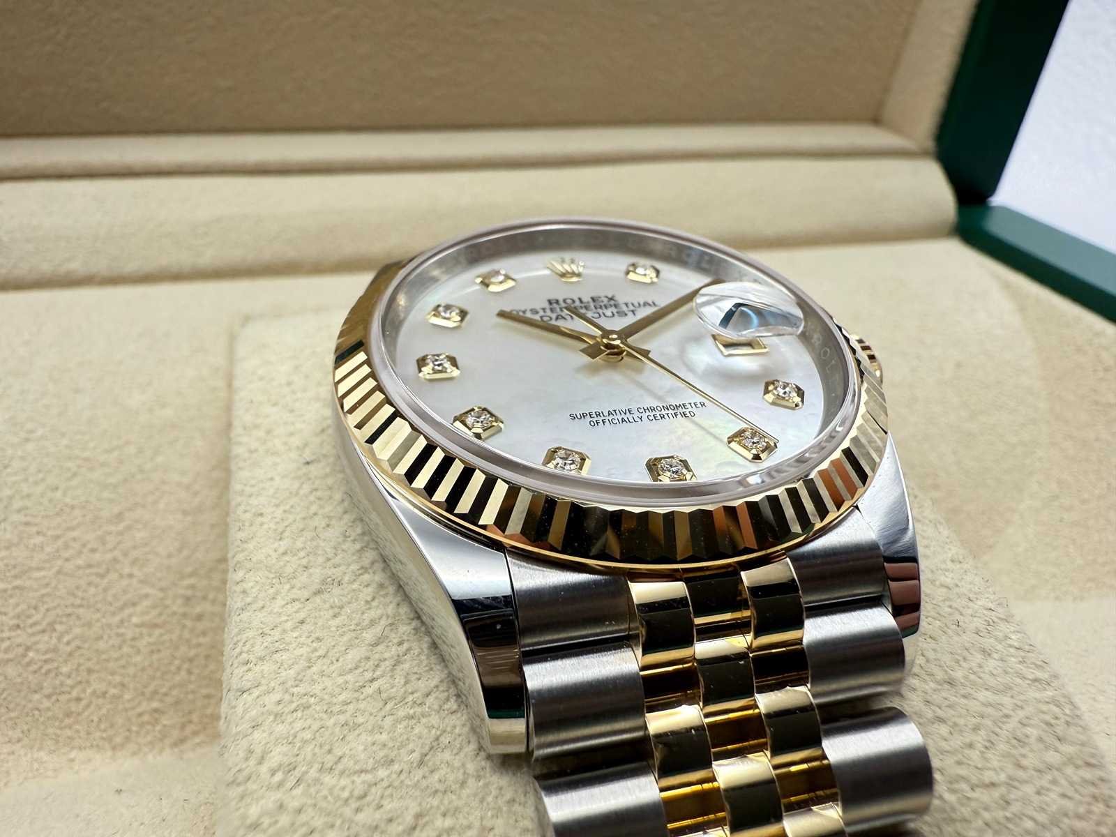 Available now is this brand-new, unworn Rolex Datejust 36 Ref. 126233, a luxurious and elegant timepiece crafted from stainless steel and 18k yellow gold. It features a stunning Mother of Pearl dial set with factory diamond hour markers, giving the watch a refined and radiant appearance. Fitted with a classic Jubilee bracelet and a fluted 18k yellow gold bezel, this Datejust offers timeless sophistication and everyday versatility. The watch comes as a full set, including the original Rolex box, warranty card, booklets, cardholder, and tag. It is backed by a 5-year international Rolex warranty. Key Features: Model: Rolex Datejust 36 Reference: 126233 Condition: Brand new, unworn Material: Stainless steel & 18k yellow gold Dial: Mother of Pearl with factory-set diamond hour markers Bracelet: Jubilee Bezel: Fluted yellow gold Warranty: 5-year Rolex international warranty Full set: Includes box, booklets, warranty card, cardholder, and Rolex tag A truly elegant and sought-after Rolex configuration, perfect for those who appreciate classic beauty with a luxurious touch. Merk: Rolex Model: Datejust 36 Bouwjaar: 2026 Referentienummer: 126233 Materiaal kast: Steel Materiaal horlogeband: Steel/Gold Jubilee Materiaal sluiting: Steel/Gold Wijzerplaat: Mother Of Pearl Diamonds Kastmaat: 36 mm