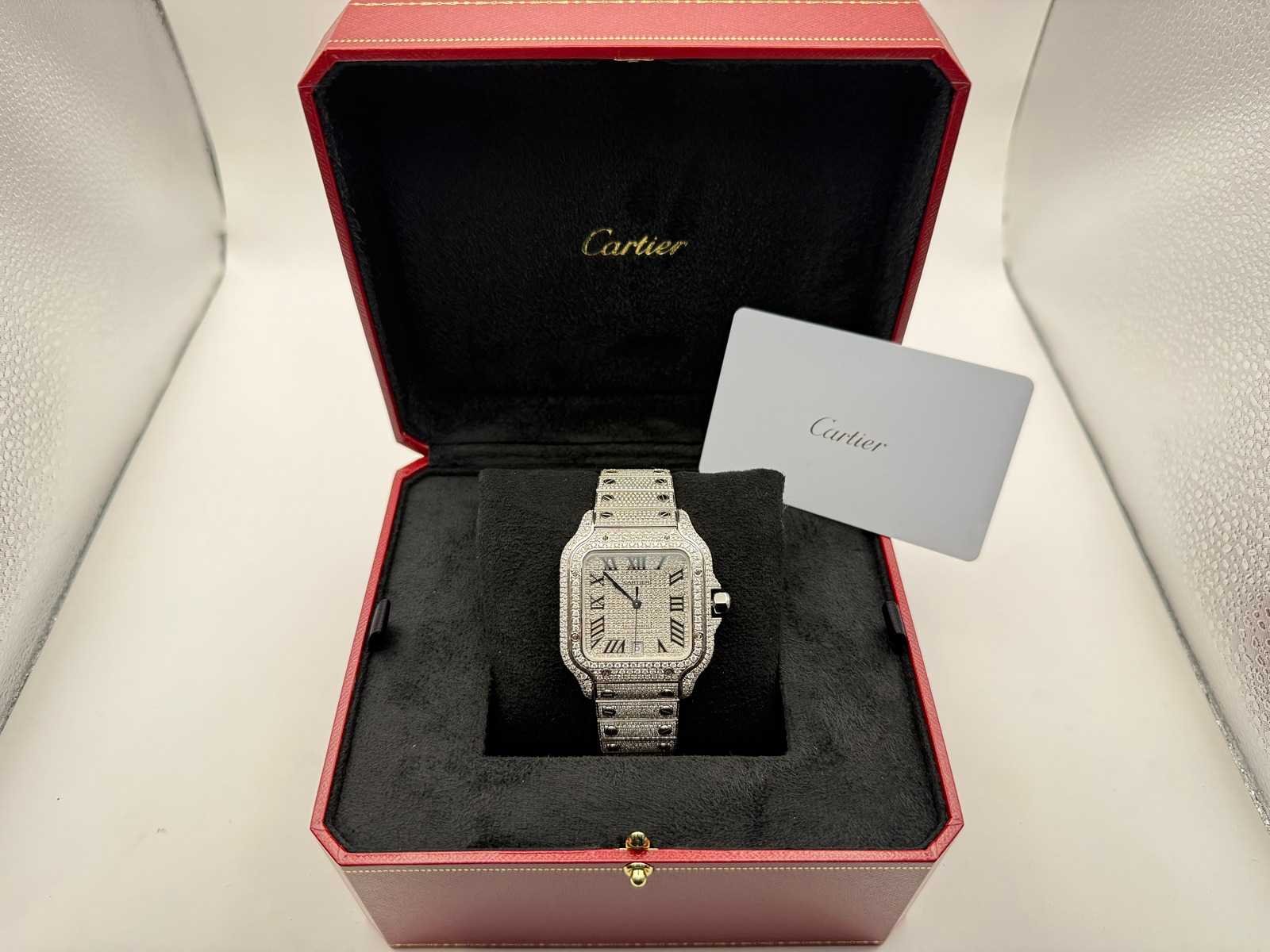 Conditie: Gloednieuw en ongedragen van 2020 • Diamantzetting: Volledig bezet met echte naturel VS diamanten, ook wel "iced out" genoemd • Complete Set: Inclusief originele Cartier doos, papieren en Cartier authenticatiepas • Referentienummer: WSSA0018 • Wijzerplaat: Iconische Cartier wijzerplaat met Romeinse cijfers volledig bezet met natural diamanten • Kast: Grote roestvrijstalen kast, perfect in harmonie met de fonkelende diamantzetting • Armband: Bijpassende roestvrijstalen armband, eveneens bezet met diamanten. Aanvullende Informatie: • Verpakking: Dit horloge wordt geleverd als een volledige set met de originele Cartier doos, officiële papieren en de Cartier authenticatiepas. Merk: Cartier Model: Santos Bouwjaar: 2020 Referentienummer: WSSA0018 Materiaal kast: Steel / Diamonds Materiaal horlogeband: Steel / Diamonds Materiaal sluiting: Steel / Diamonds Wijzerplaat: Diamonds Kastmaat: 39 mm