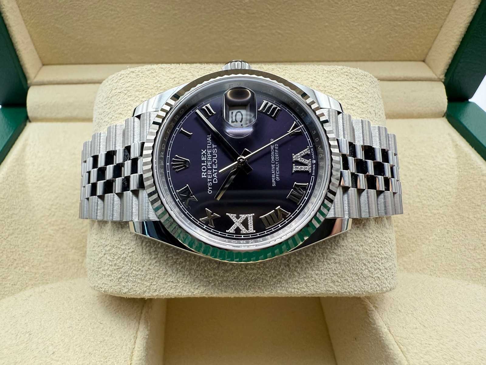 A brand-new, unworn Rolex Datejust 36 Ref. 126234, a perfect blend of timeless design and refined luxury. Crafted from stainless steel, this model features a striking purple dial with factory-set diamond markers at 6 and 9 o’clock, adding a subtle yet elegant sparkle to the watch. It is fitted with a classic Jubilee bracelet and finished with an 18k white gold fluted bezel, making it ideal for both everyday wear and formal occasions. This watch is sold as a full set, including the original Rolex box, warranty card, booklets, cardholder, and Rolex tag. Backed by a 5-year international Rolex warranty. Key Features: Model: Rolex Datejust 36 Reference: 126234 Condition: Brand new, unworn Material: Stainless steel with 18k white gold fluted bezel Dial: Purple with original diamond markers at 6 & 9 Bracelet: Jubilee Warranty: 5-year international Rolex warranty Full set: Includes box, booklets, warranty card, cardholder, and Rolex tag A unique and elegant configuration that stands out in any collection. Merk: Rolex Model: Datejust 36 Bouwjaar: 2026 Referentienummer: 126234 Materiaal kast: Steel Materiaal horlogeband: Steel Jubilee Fluted Materiaal sluiting: Steel Wijzerplaat: Purple With Diamonds