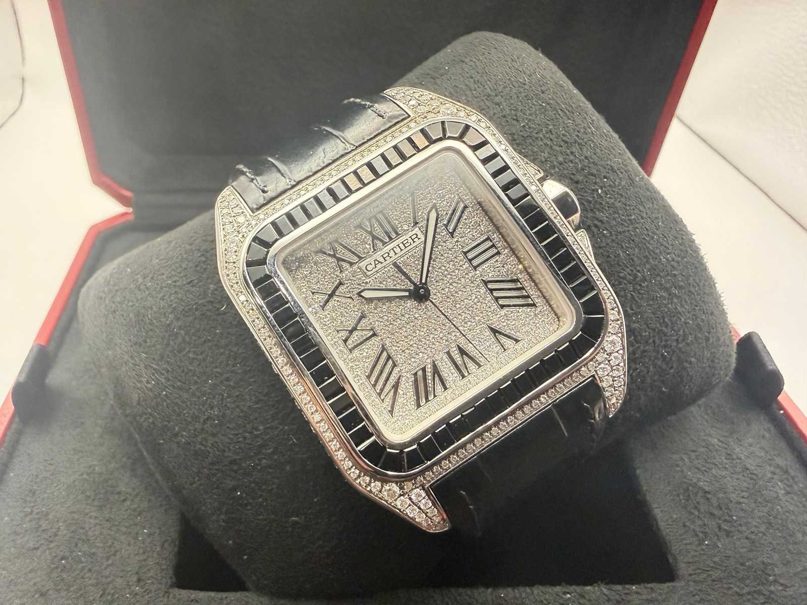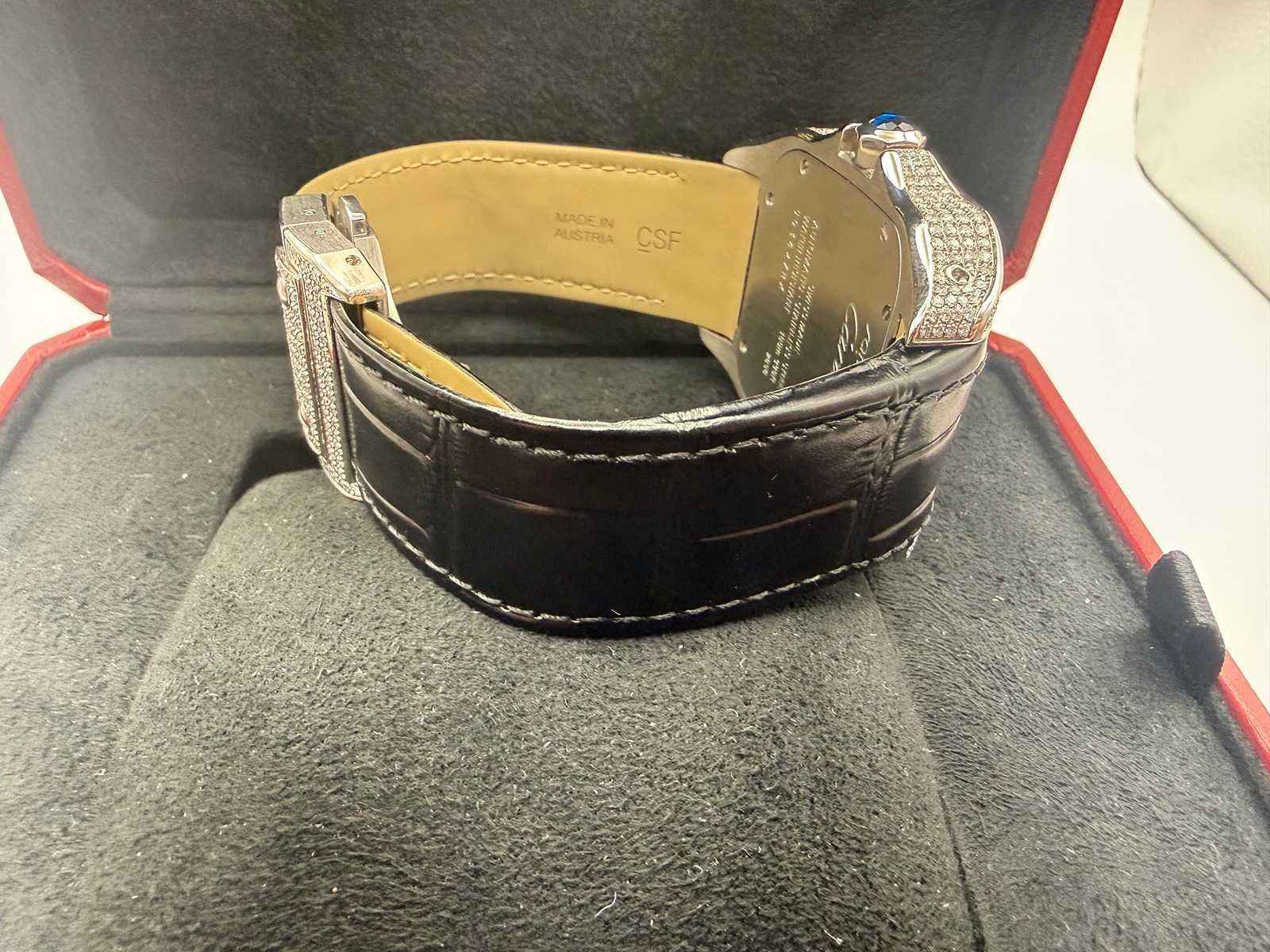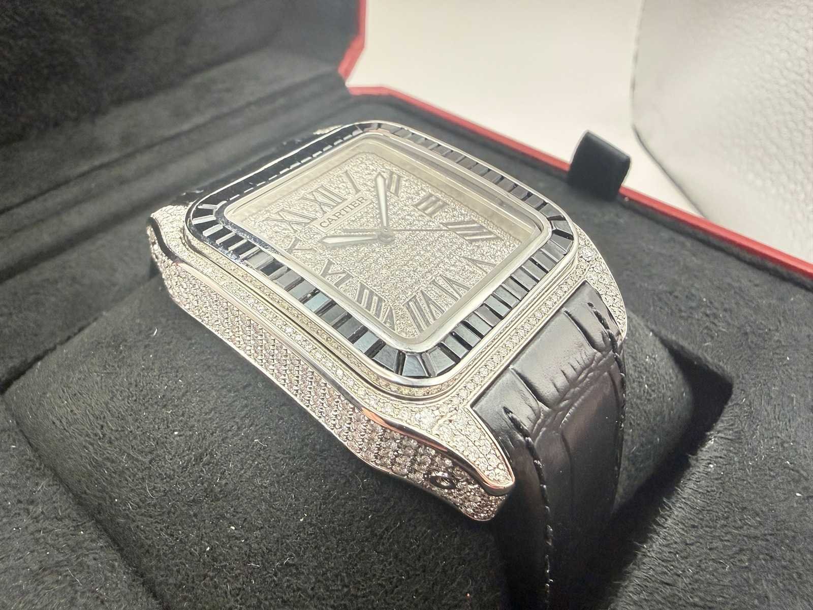 Model: Cartier Santos 100 Medium Case & Dial: Fully iced out with real genuine natural VS diamonds Bezel: Moissanite baguette stones Strap: High-quality leather strap Condition: Custom luxury piece Style: Exclusive, bold, and elegant Please note: this is a customised watch, meaning it may include components that differ from the original factory specifications. Customisation can vary widely, so we highlight the following possibilities for full transparency: Aftermarket parts The watch may include third-party components (such as bezels, dials, hands, crystals or gem settings) that are not produced by the brand owner. These parts are often added for aesthetic reasons, but are not considered original by the manufacturer. Original parts from other models Some components (e.g. dials or bracelets) may have been sourced from other genuine watches by the same brand. While these parts are authentic, they were not originally fitted to this particular model or reference, which may affect collectability or eligibility for manufacturer service. Non-original parts In some cases, customised watches may include parts that are neither original nor manufactured by the brand. These components can affect the watch’s value. We encourage all bidders to carefully review the photos and description before placing a bid. Keep in mind: customised watches may not be eligible for official service or warranty from the brand. All bids should be placed with full awareness of the customisation status described above. Merk: Cartier Model: Santos 100 XL Bouwjaar: 2024 Referentienummer: 2656 Materiaal kast: Staal / Diamonds Materiaal horlogeband: Leer Materiaal sluiting: Staal / Diamonds Wijzerplaat: Diamonds Uurwerk: Automatisch Kastmaat: 38 mm