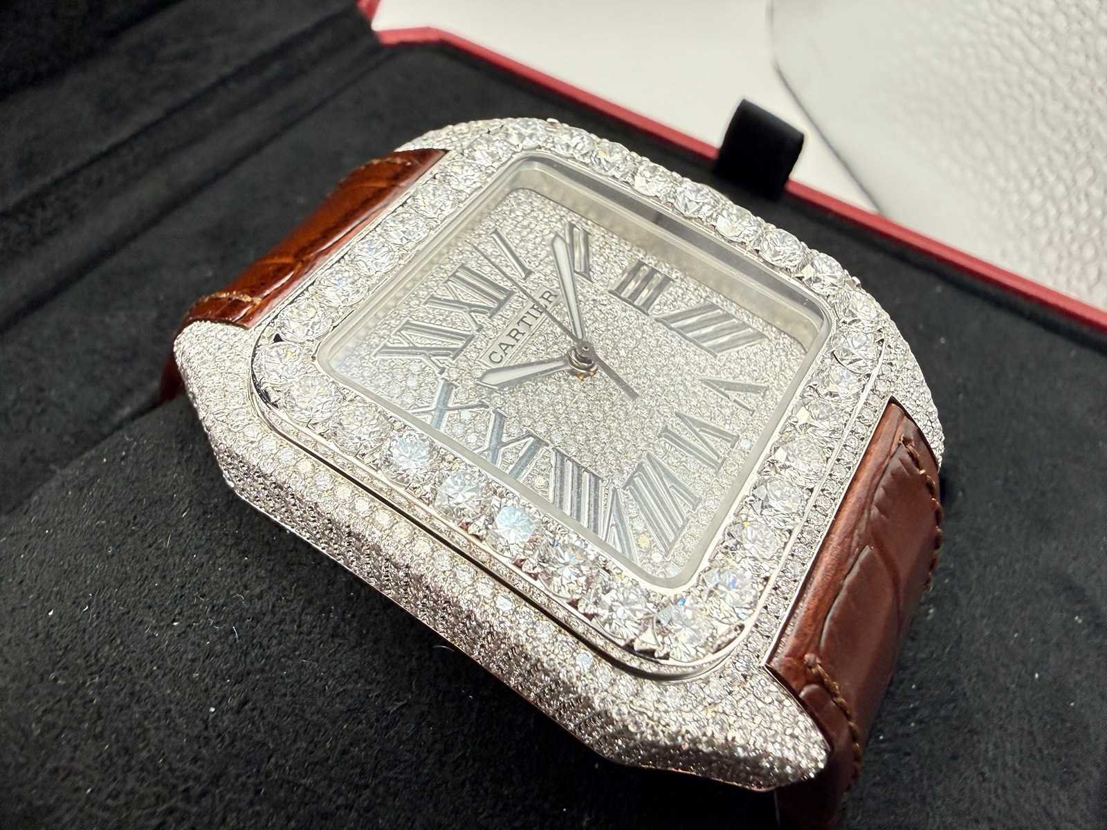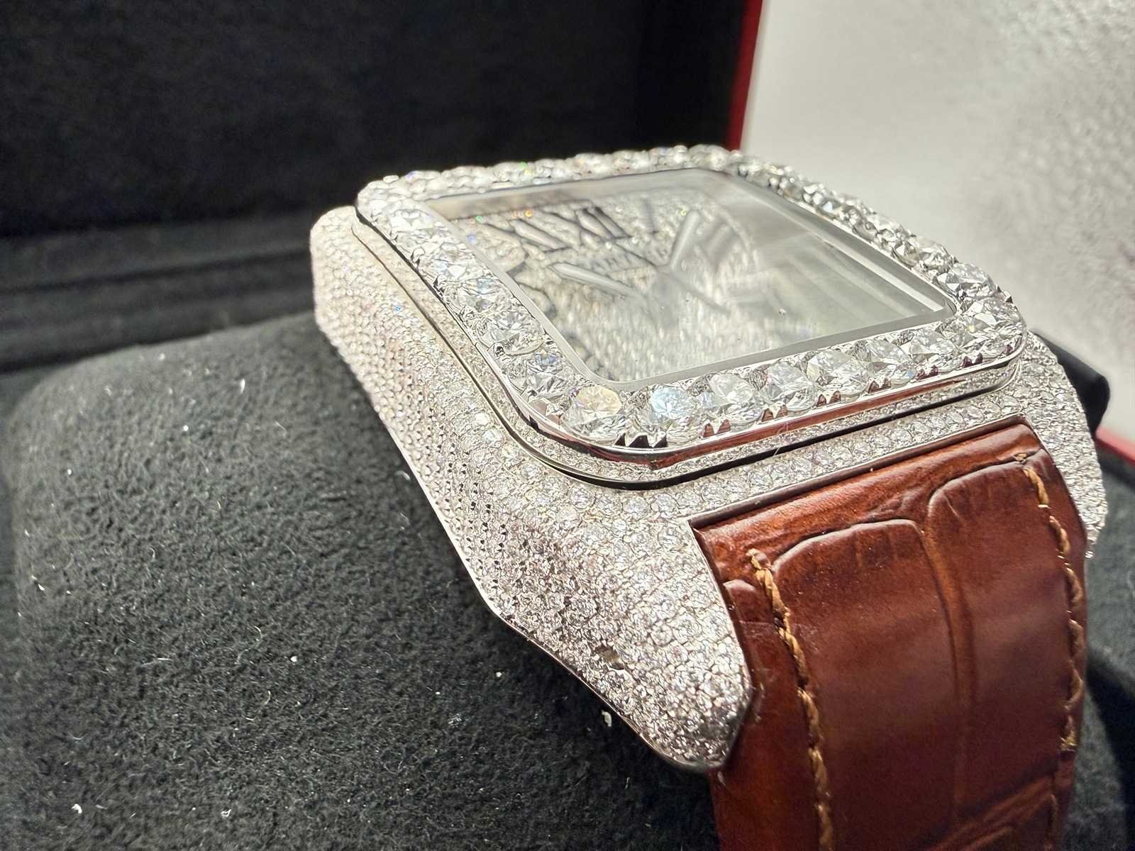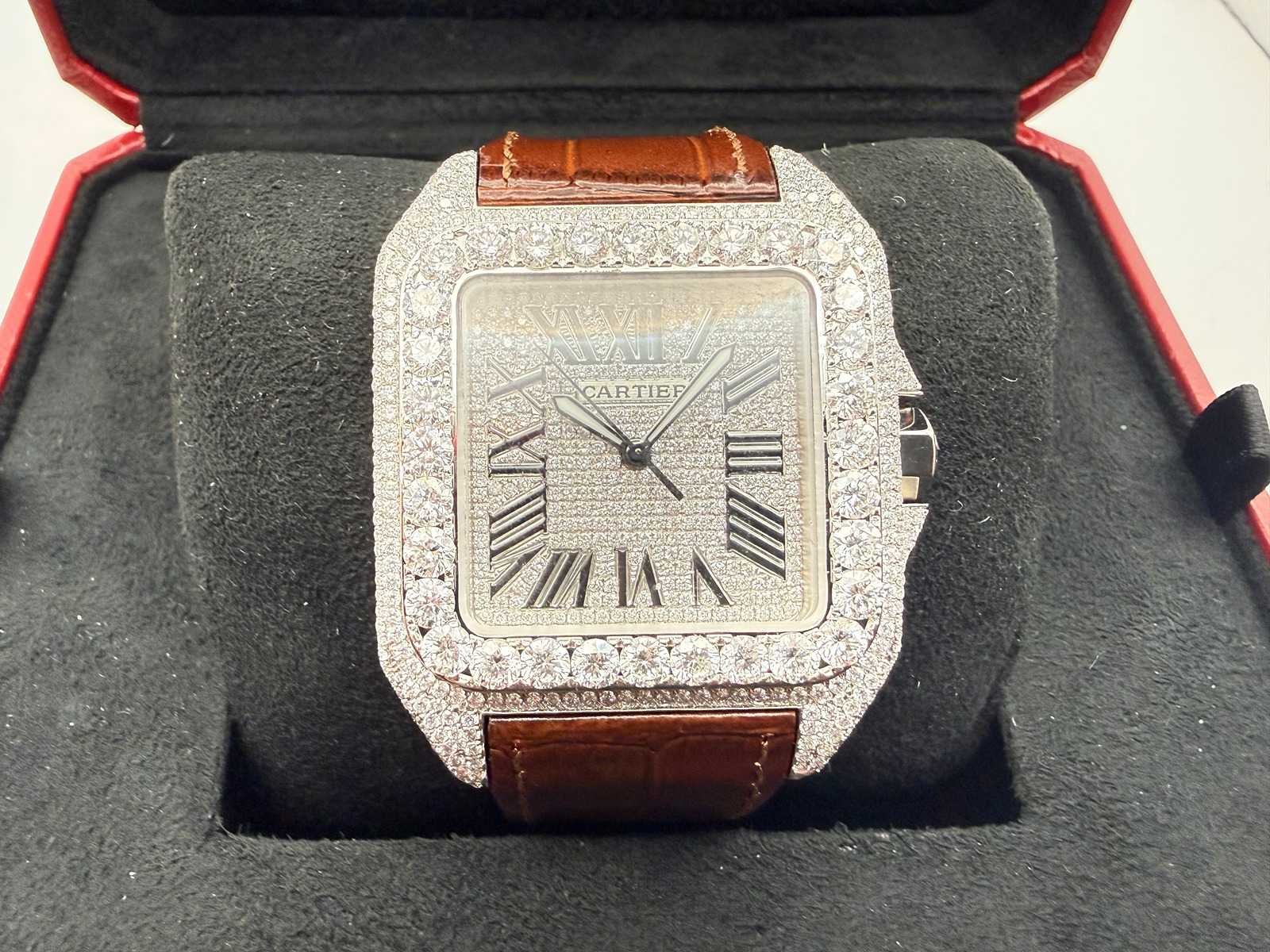 Model: Cartier Santos 100 XL Case: Fully iced out Diamonds: 12.5 carats lab-grown VVS diamonds Documents: No Strap: Brown leather strap Style: Bold luxury statement watch Condition: Excellent / unworn Comes with a Box Please note: this is a customised watch, meaning it may include components that differ from the original factory specifications. Customisation can vary widely, so we highlight the following possibilities for full transparency: Aftermarket parts The watch may include third-party components (such as bezels, dials, hands, crystals or gem settings) that are not produced by the brand owner. These parts are often added for aesthetic reasons, but are not considered original by the manufacturer. Original parts from other models Some components (e.g. dials or bracelets) may have been sourced from other genuine watches by the same brand. While these parts are authentic, they were not originally fitted to this particular model or reference, which may affect collectability or eligibility for manufacturer service. Non-original parts In some cases, customised watches may include parts that are neither original nor manufactured by the brand. These components can affect the watch’s value. We encourage all bidders to carefully review the photos and description before placing a bid. Keep in mind: customised watches may not be eligible for official service or warranty from the brand. All bids should be placed with full awareness of the customisation status described above. Merk: Cartier Model: Santos 100 XL Bouwjaar: 2022 Materiaal kast: Steel / Diamonds Materiaal horlogeband: Brown Leather Strap Materiaal sluiting: Steel / Diamonds Wijzerplaat: Diamonds Kastmaat: 38 mm