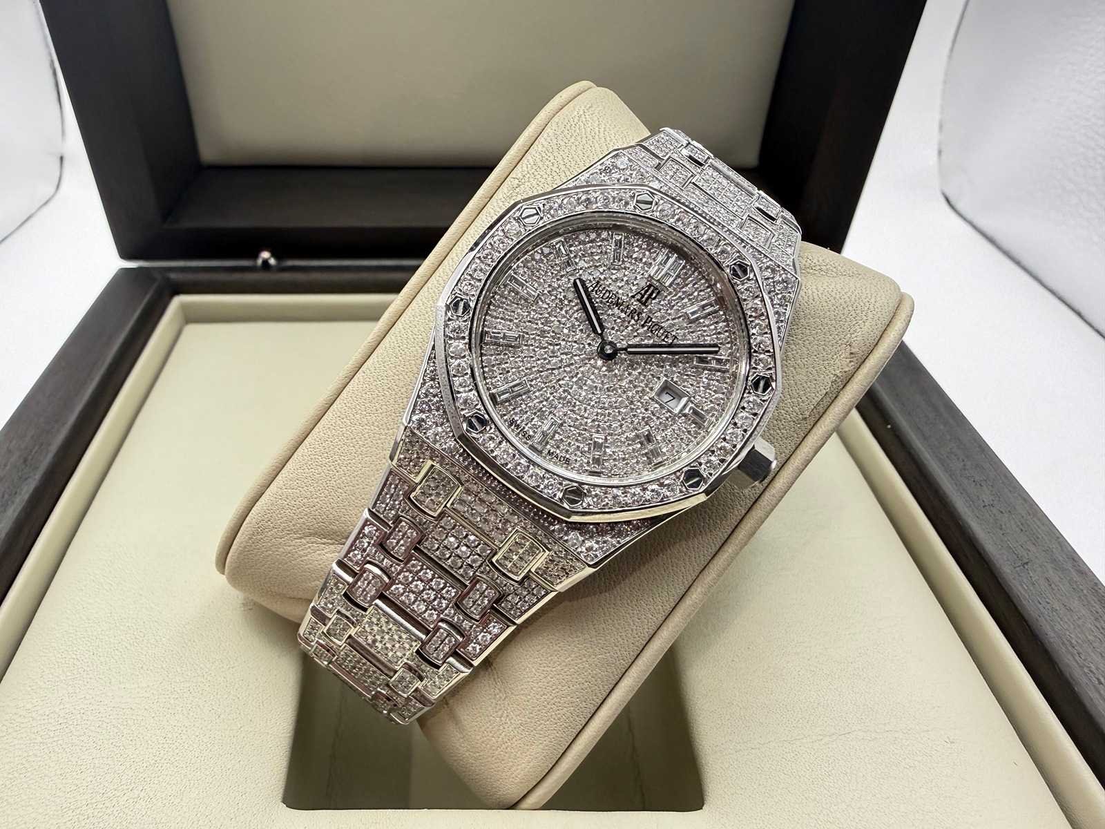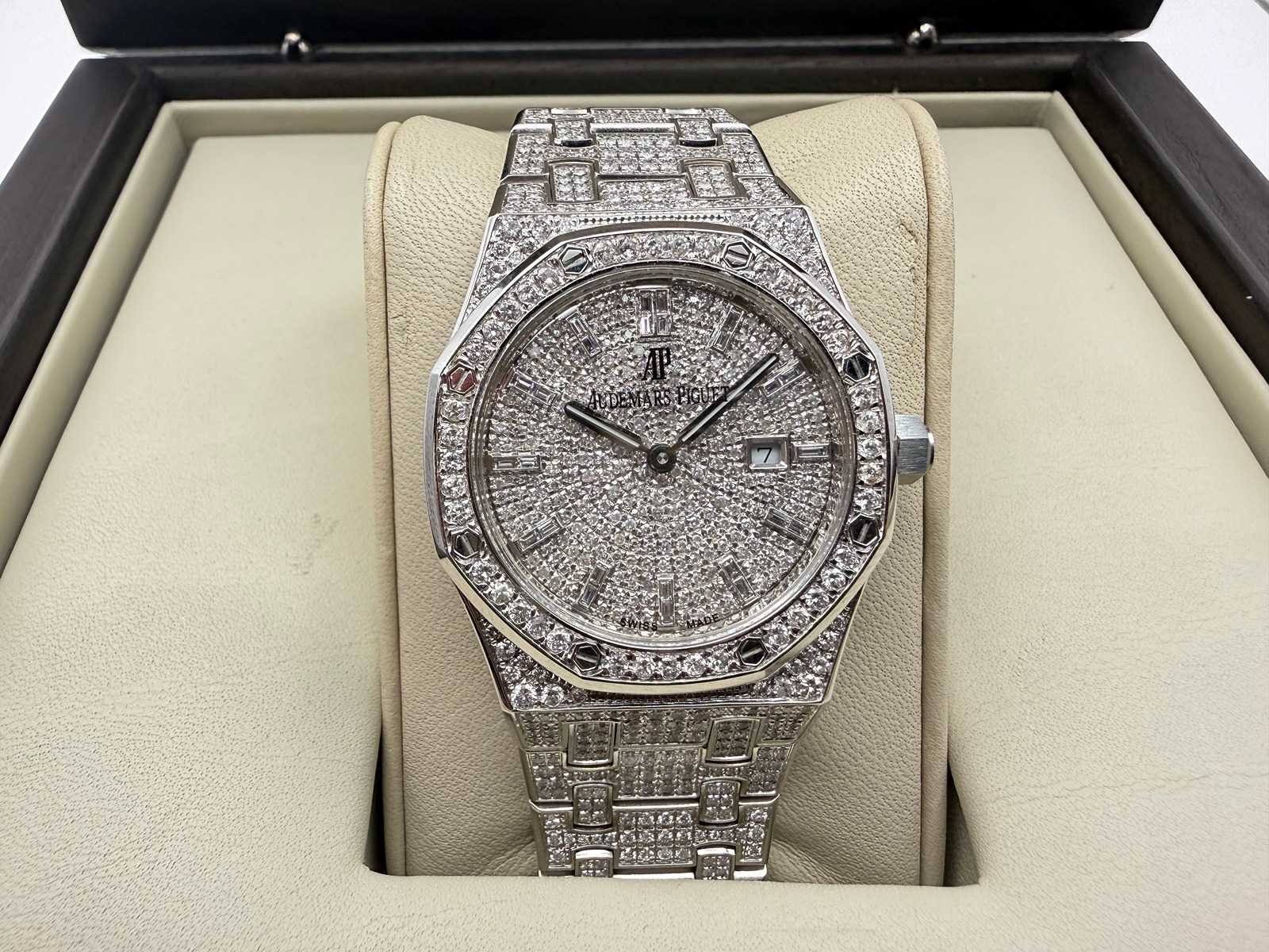 Lease note: this is a customised watch, meaning it may include components that differ from the original factory specifications. Customisation can vary widely, so we highlight the following possibilities for full transparency: Aftermarket parts The watch may include third-party components (such as bezels, dials, hands, crystals or gem settings) that are not produced by the brand owner. These parts are often added for aesthetic reasons, but are not considered original by the manufacturer. Original parts from other models Some components (e.g. dials or bracelets) may have been sourced from other genuine watches by the same brand. While these parts are authentic, they were not originally fitted to this particular model or reference, which may affect collectability or eligibility for manufacturer service. Non-original parts In some cases, customised watches may include parts that are neither original nor manufactured by the brand. These components can affect the watch’s value. We encourage all bidders to carefully review the photos and description before placing a bid. Keep in mind: customised watches may not be eligible for official service or warranty from the brand. All bids should be placed with full awareness of the customisation status described above. Merk: Audemars Piquet Model: Royal Oak Lady Bouwjaar: 2024 Referentienummer: 6007ST Materiaal kast: Staal / Diamonds Materiaal horlogeband: Staal / Diamonds Materiaal sluiting: Staal / Diamonds Wijzerplaat: Diamonds Uurwerk: Quartz Kastmaat: 26 mm