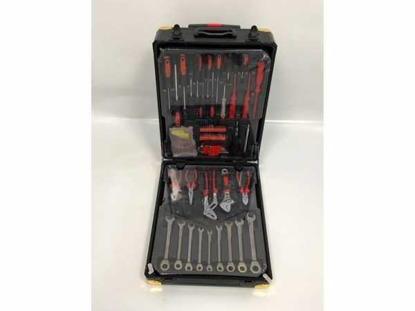 W.o. steek- ringsleutel met ratel; diverse tangen; doppenset met ratel; diverse schroevendraaiers; precisieschroevendraaiers; inbussleutel; diverse bits; klauwhamer; krimptang; schaar; rolmaat; waterpas; hetelijmpistool; kunststof klemmen; tapijtmes; 2161; Type: 186 delig Kunststof: false Aluminium: true Canvas: false Met inhoud: true Afmeting l: 210mm Afmeting b: 370mm Afmeting h: 520mm