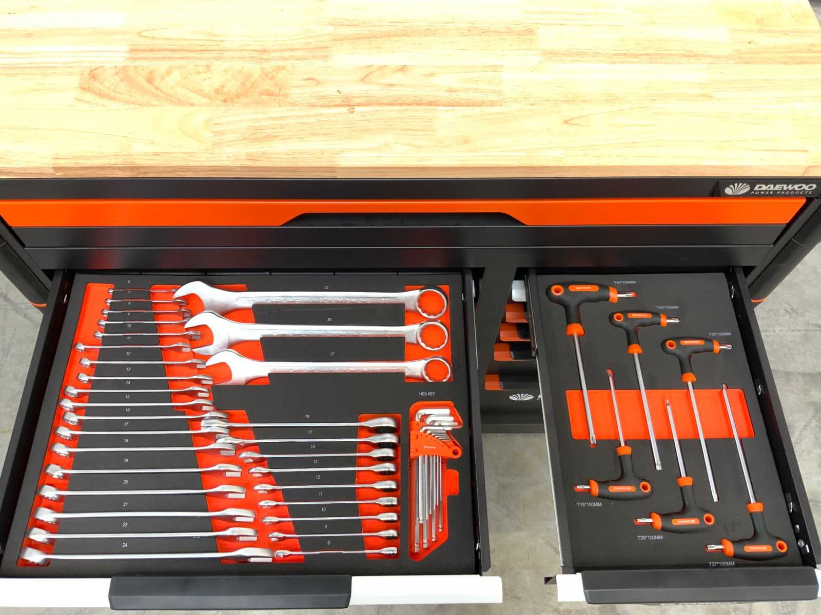 267 delig; 13 lades waarvan 11 lades gevuld; 12 tangen; 12 hamers; 8 Files ; 6 zeshoek sleutels; 6 T-Handle ; 21 schroevendraaiers; 40 steeksleutels; 10 imbus sleutels; 127 doppen en bitjes; 25 sleutels ; houten werkblad; verrijdbaar; remmen; 2 delen afsluitbaar; 5595 Merk: Daewoo Model: DAMWS267 Type: 267 delig Lengte: 106cm Breedte: 57cm Hoogte: 110cm