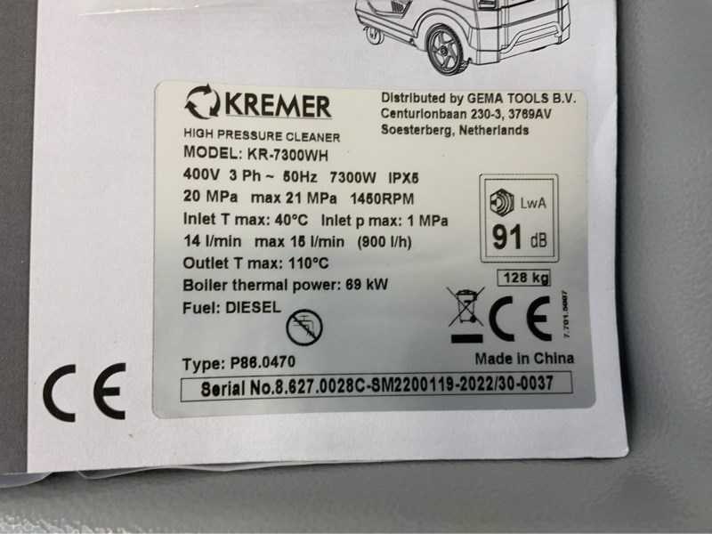 Temperatuurbereik max.: 140 °c; capaciteit: 900 l/hr; vermogen: 7,3 kW; aansluiting: 400 V; eigen gewicht: 128 kg; totale afmeting L: 1150 mm; totale afmeting B: 620 mm; totale afmeting H: 850 mm; omschrijving: ongebruikt in houten kist; 4460; Merk: Kremer Type: KR7300 Bouwjaar: 2024 Max. druk: 210bar Gewicht: 128kg Lengte: 1150cm Breedte: 620cm Hoogte: 850cm