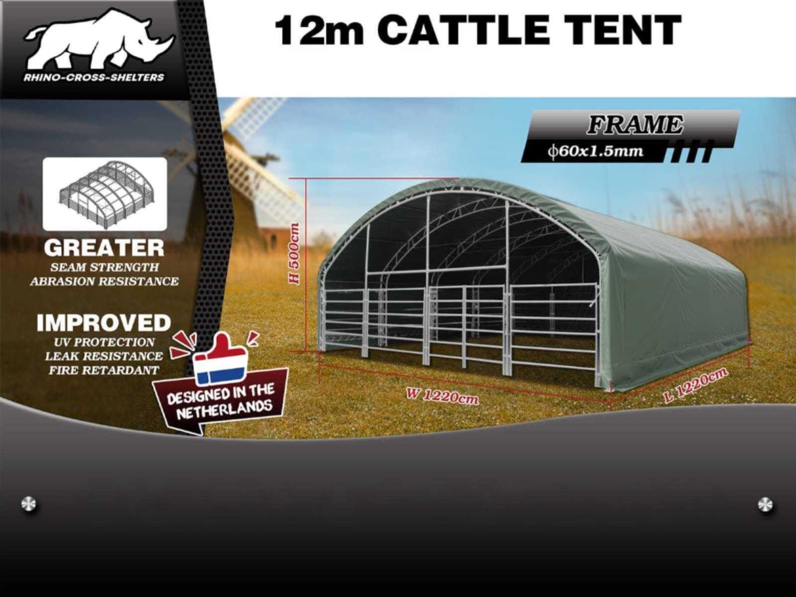 LET OP: Kavel is niet beschikbaar op de kijkdag. Voorzien van opslagtent / dierenverblijf; dubbel trussen-/buizensysteem; gegalvaniseerd; kleur army green; inclusief montage handleiding; ongebruikt in 2 metalen kisten (transport afmetingen kist 1 303x110x90 cm, kist 2 303x110x150 cm) Merk: Rhino-cross-shelters Model: 12 Meter Product type: Cattle tent 12,2x12,2x5 m Gewicht: 2213kg Lengte: 1220cm Breedte: 1220cm Hoogte: 500cm Materiaal: 610g PVC