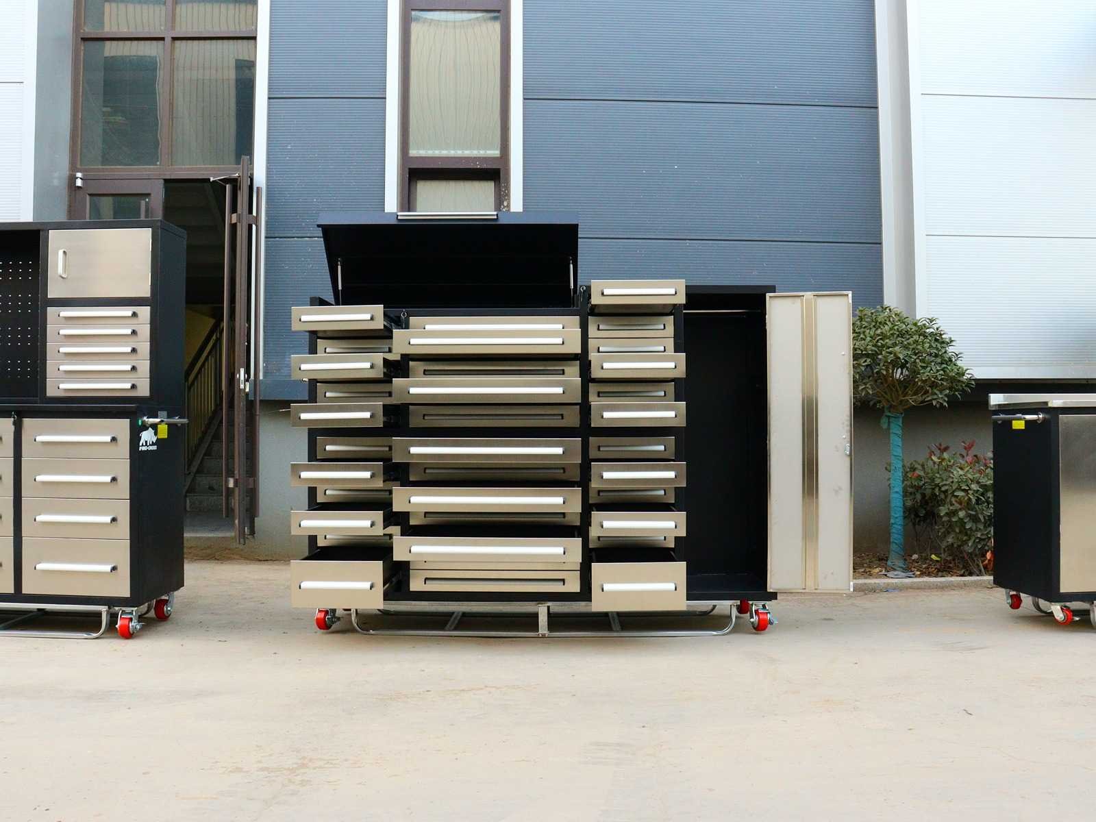 Voorzien van Gepoedercoat staal; 35 lades; 1 Deur; 1 bovenkast; Ongebruikt (Transport afmetingen 2875x725x1140mm) Merk: Rhino-Cross-Workbench Product type: H7ft-35D-1-L-01C RVS