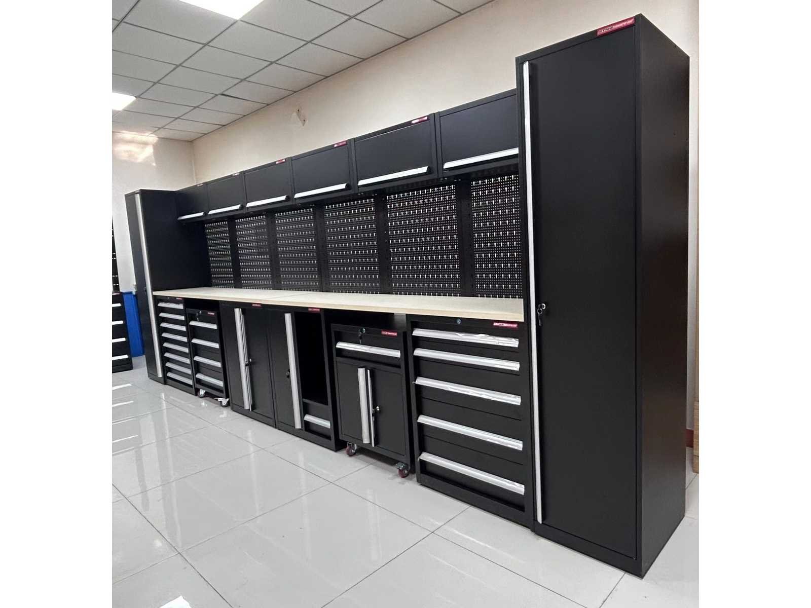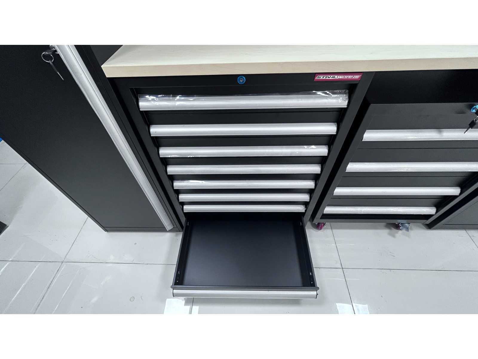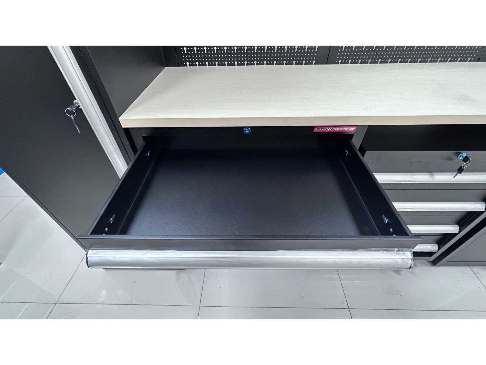 Voorzien van poeder coating; 30 mm houten werkblad; kleur zwart; ongebruikt in dozen (transport afmeting 3 m3) Merk: Stahlworks Model: TC-202 Product type: 550x55x203 cm Materiaal: SPCC steel