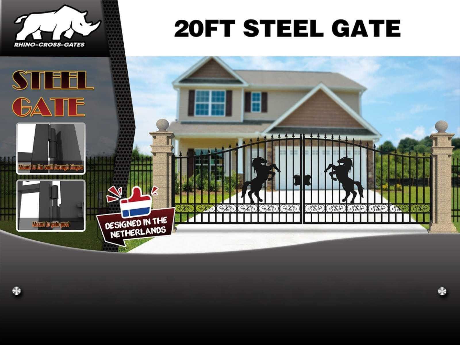 Voorzien van zwarte poedercoating / lakafwerking; 230 cm hoog in het midden; 180 cm hoog aan de zijkanten; buiten frame 50x50x2 mm; binnen frame 25x25x1,2 mm; ongebruikt Merk: Rhino-Cross-Gates Model: Paard Product type: 596CM Kleur: Zwart Breedte: 596cm Hoogte: 230cm
