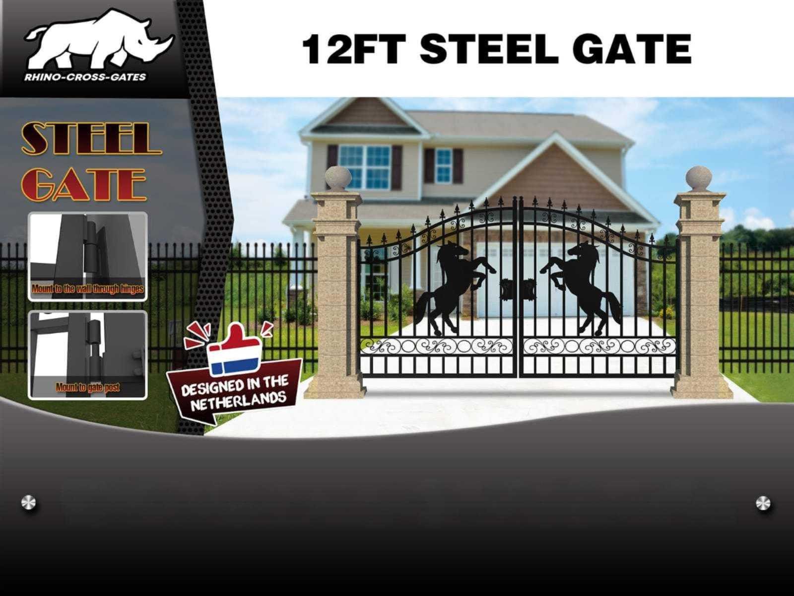 Voorzien van zwarte poedercoating / lakafwerking; 230 cm hoog in het midden; 180 cm hoog aan de zijkanten; buiten frame 50x50x2 mm; binnen frame 25x25x1,2 mm; ongebruikt Merk: Rhino-Cross-Gates Model: Paard Product type: 365CM Kleur: Zwart Breedte: 433cm Hoogte: 230cm