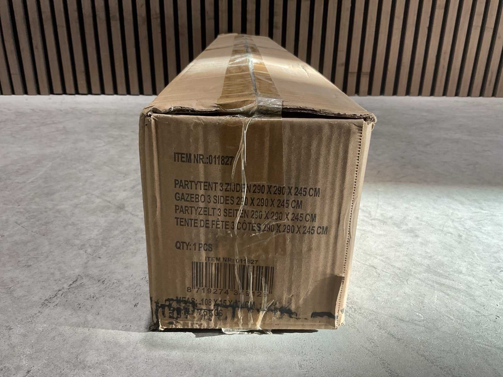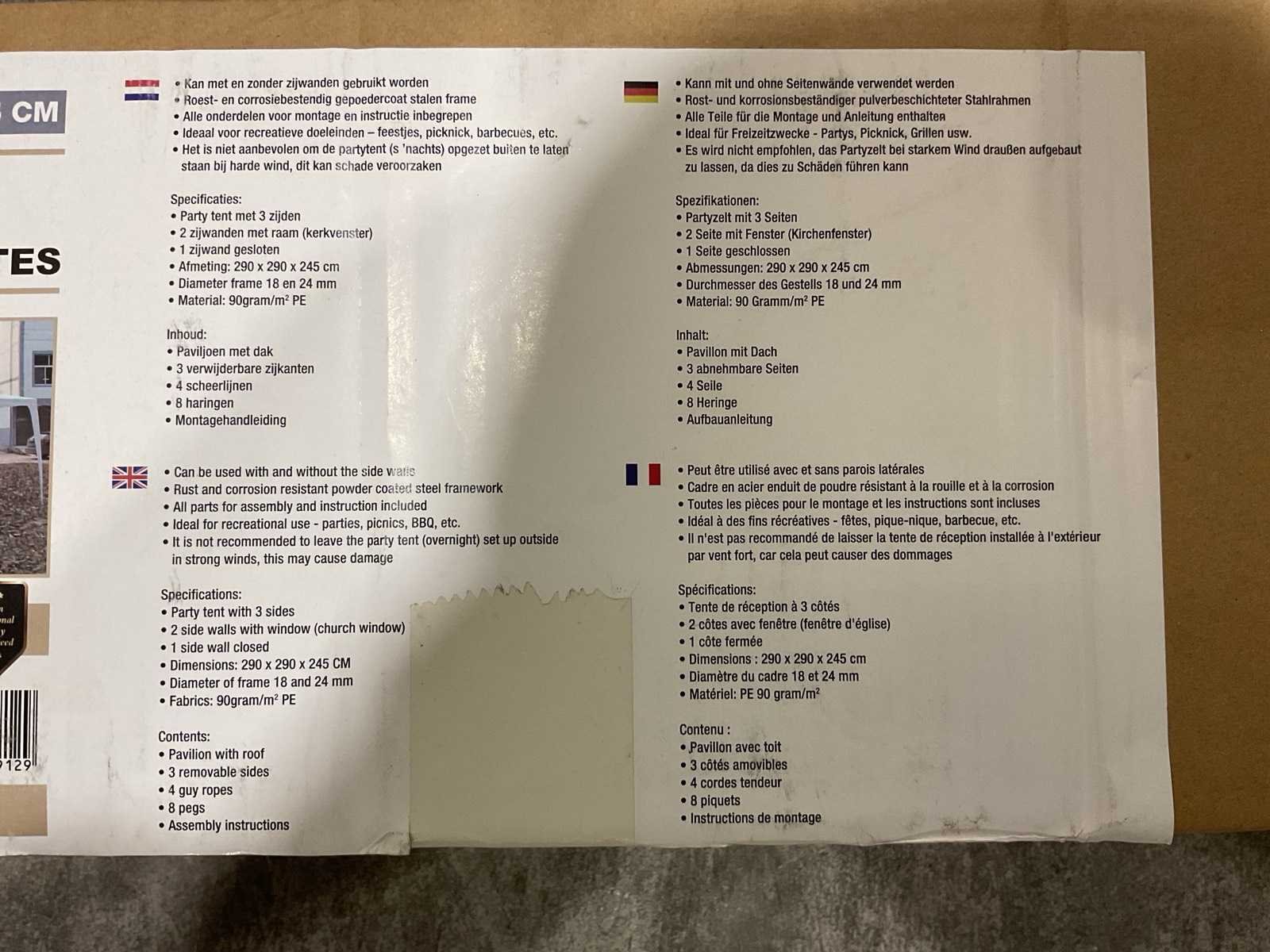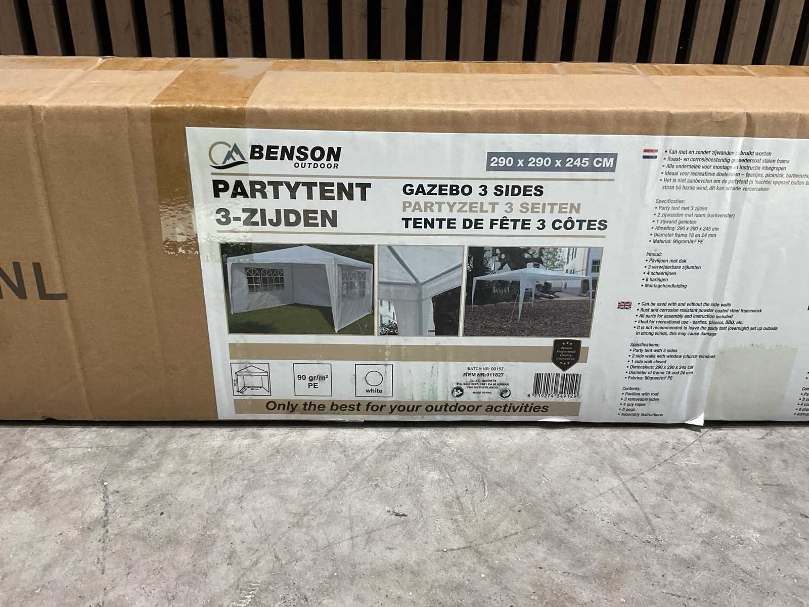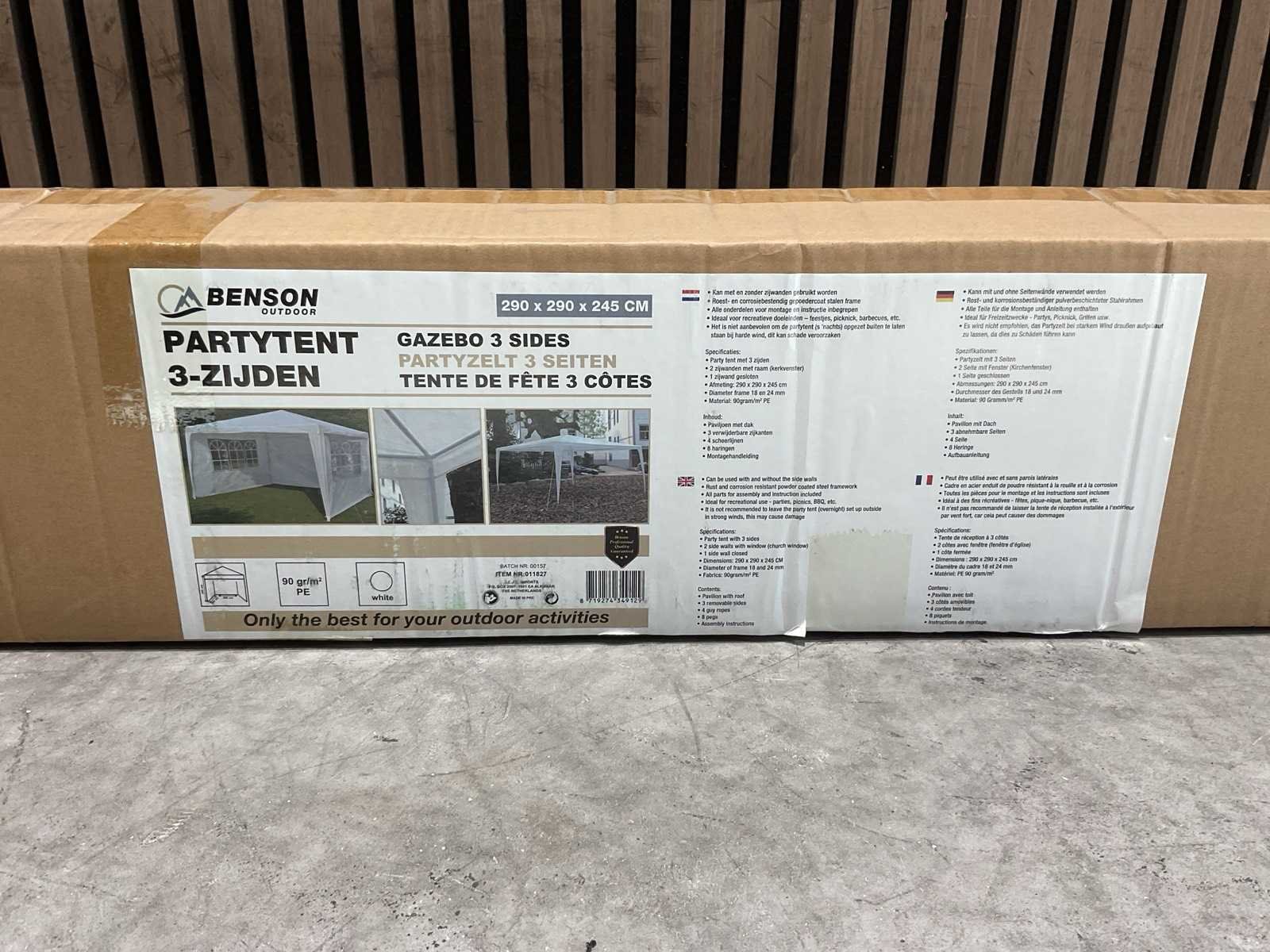 Voorzien van Lengte 290cm; Breedte 290cm; Hoogte 245cm; Doekmateriaal: PE (polyethyleen); Doekdikte: 90 g/m²; Frame: Metalen buizen; Transport: 7.5 kg 108x15x17 cm; Ongebruikt in doos Merk: Benson outdoor Model: 3-zijden Product type: 0011827