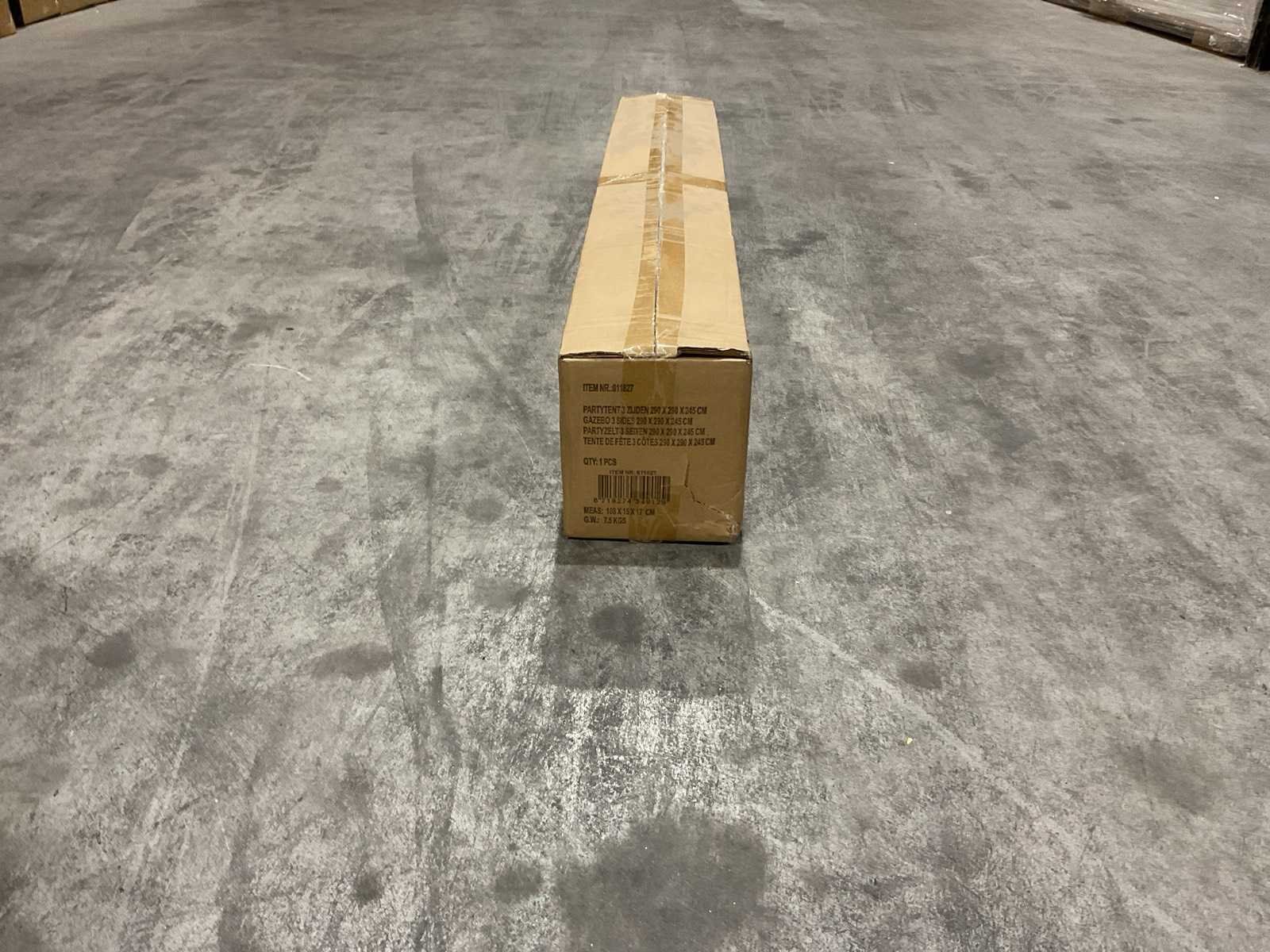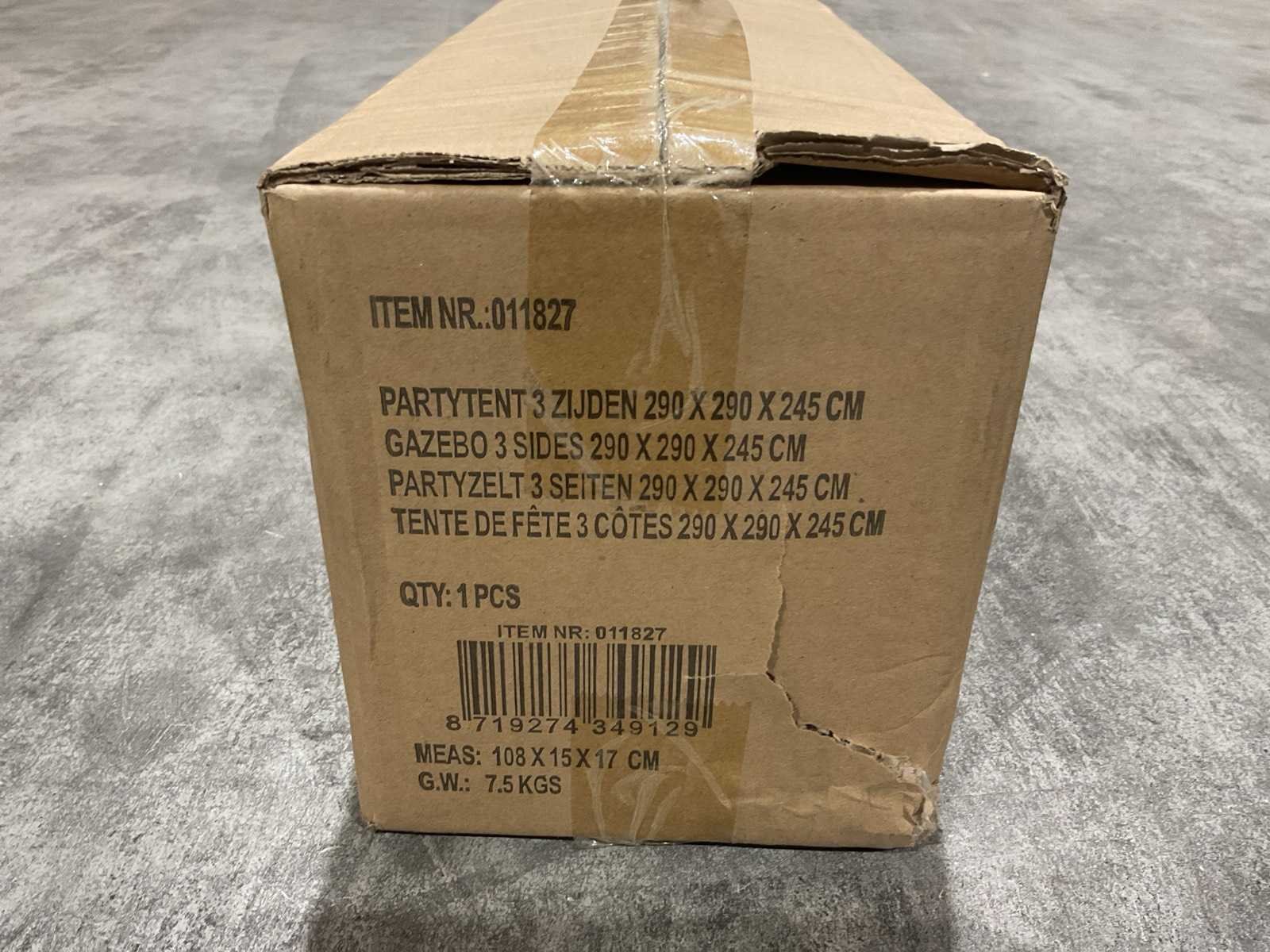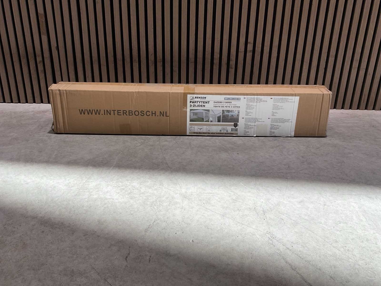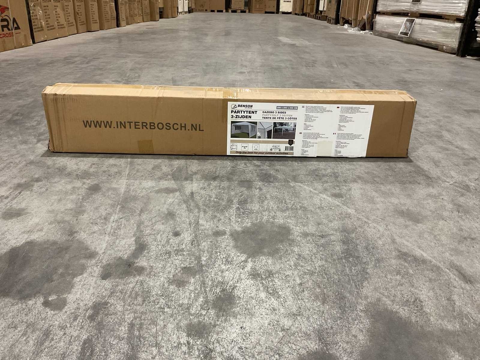 Voorzien van Lengte 290cm; Breedte 290cm; Hoogte 245cm; Doekmateriaal: PE (polyethyleen); Doekdikte: 90 g/m²; Frame: Metalen buizen; Transport: 7.5 kg 108x15x17 cm; Ongebruikt in doos Merk: Benson outdoor Model: 3-zijden Product type: 0011827