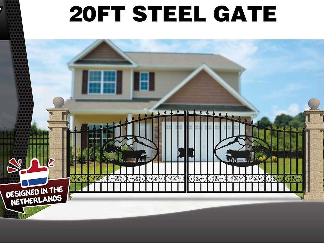 Voorzien van zwarte poedercoating / lakafwerking; 230 cm hoog in het midden; 180 cm hoog aan de zijkanten; buiten frame 50x50x2 mm; binnen frame 25x25x1,2 mm; ongebruikt Merk: Rhino-Cross-Gates Product type: 596 cm koe stijl Kleur: Zwart Breedte: 596cm Hoogte: 230cm