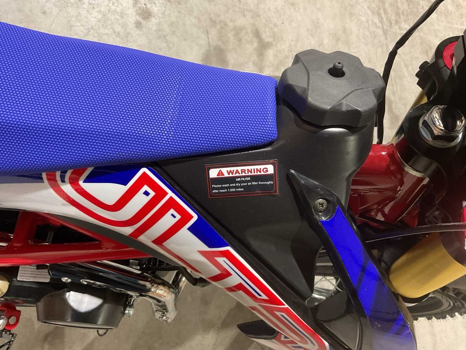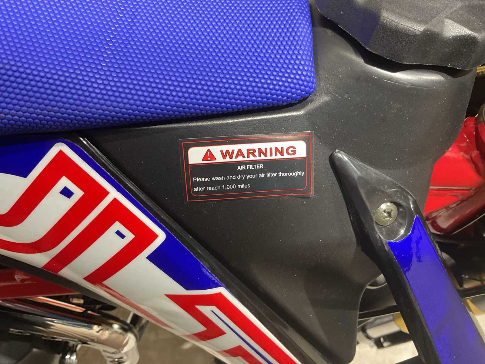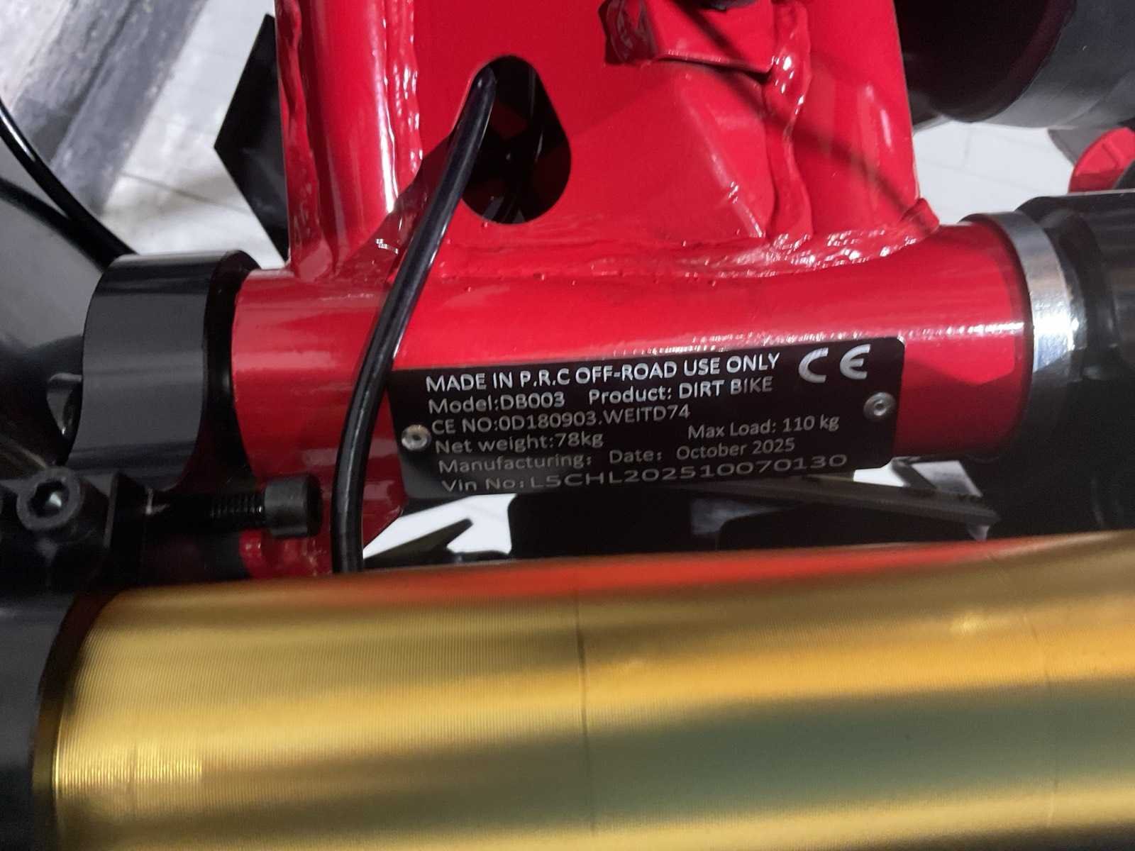 Voorzien van motor: 125 cc, 4-takt, 11 pk; Brandstof: benzine (4-takt); Transmissie: schakel; Remmen: hydraulische schijfremmen; Bandenmaat: voor 17" / achter 14"; Transportafmetingen (in doos): 135 × 45 × 65 cm; Transport gewicht: 78kg; ongebruikt in doos Merk: Ultra Motocross Model: DB003 Type: Pitbike 2025 RD Cilinderinhoud: 125cc Gewicht: 71kg Kleur: Rood