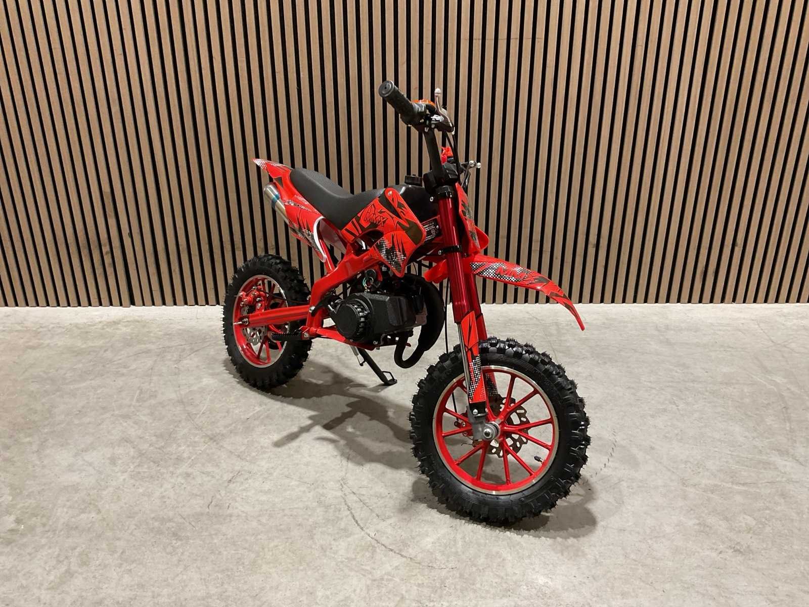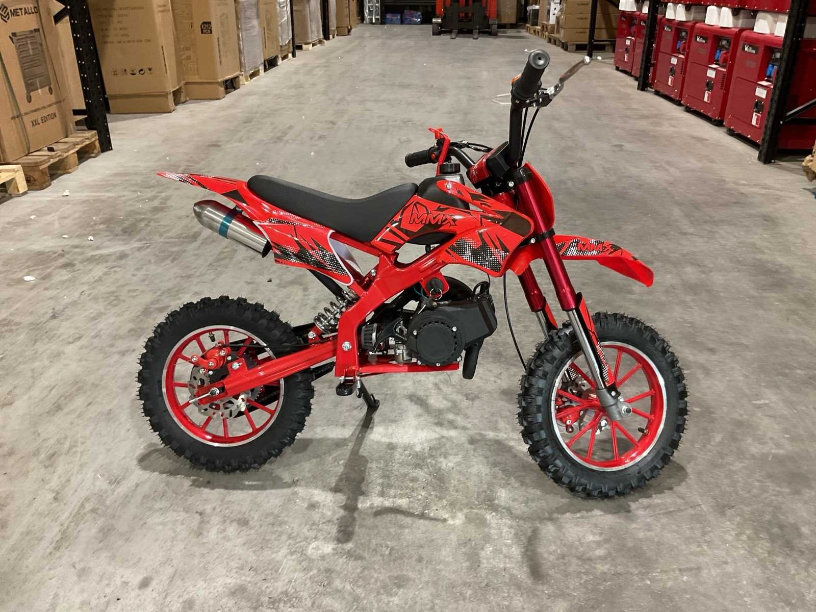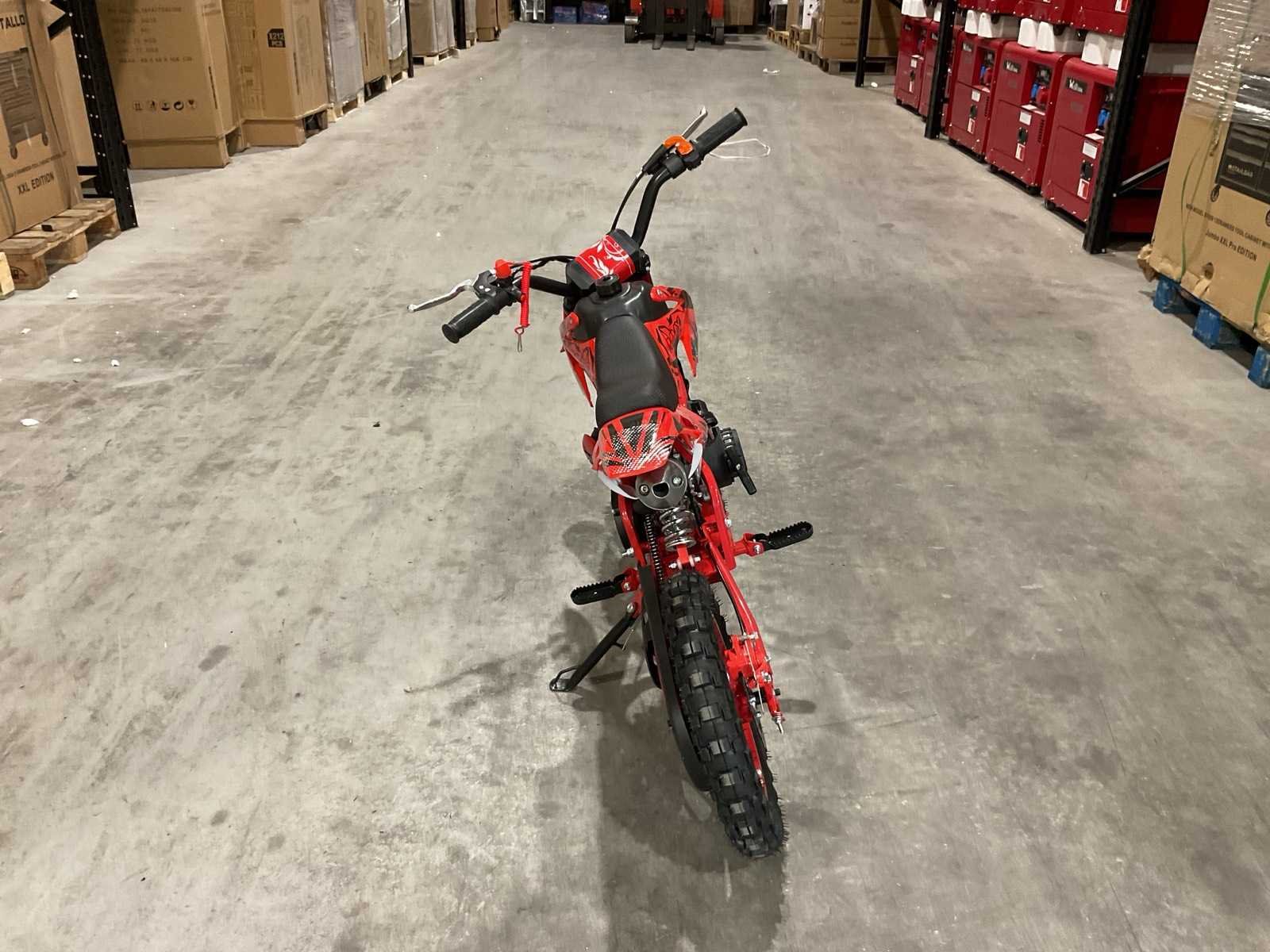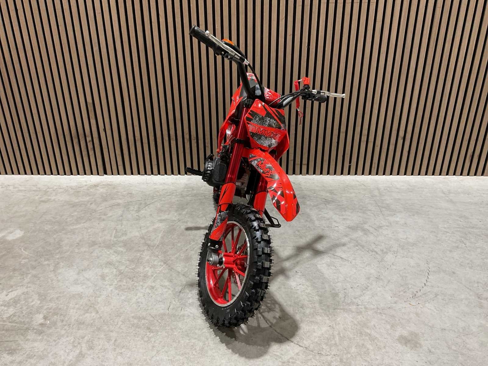 Voorzien van 49 cc, 2-takt benzinemotor luchtgekoeld; 3,5 pk; Trekstart; Transmissie: Automatische koppeling, kettingaandrijving; Mengsmering 2-takt; Top-snelheid: 40 km/u met snelheidsbegrenzers; Stalen buizenframe; Voor & achter schijfremmen; Voorvork + achter schokbrekers; Zithoogte: 55 CM; Max. laadvermogen: 60 kg; Gewicht: 22kg; Ongebruikt in doos (Transport 107x27.5x56cm, Gewicht 24kg) Merk: MMX Model: Dirt Bike 49cc Rood Type: TWHHPB-003 Brandstof: 2 takt Cilinderinhoud: 49cc Gewicht: 22kg Vermogen (kW): 3.5kW Kleur: Rood