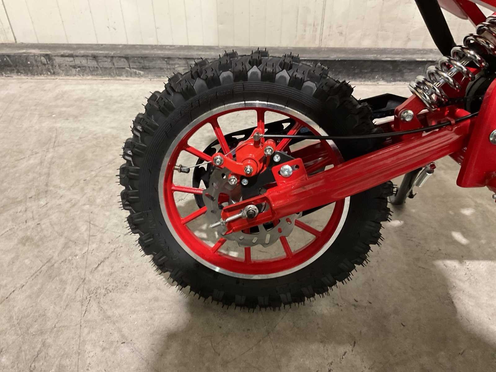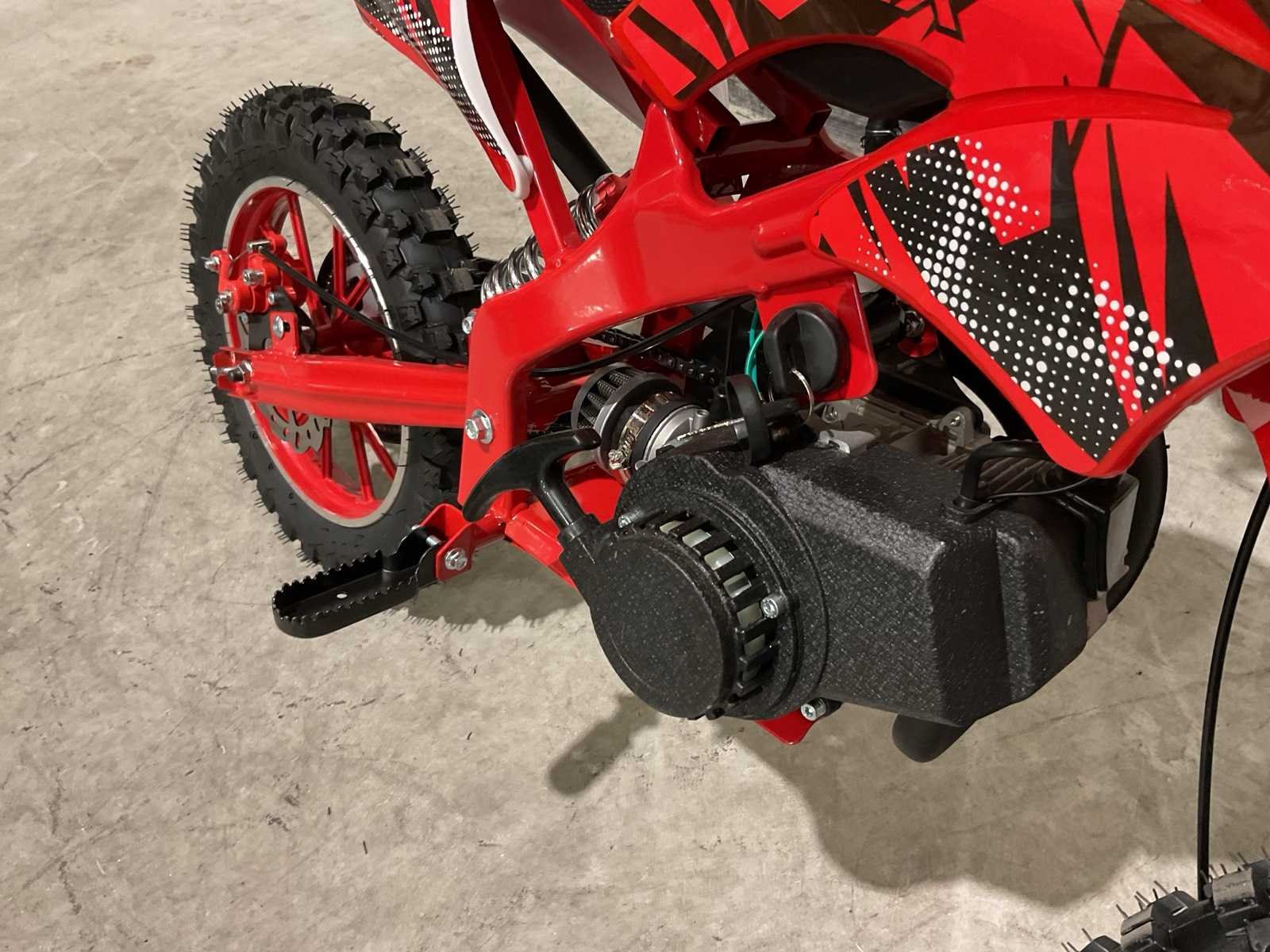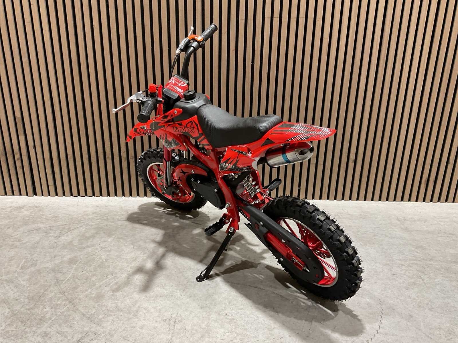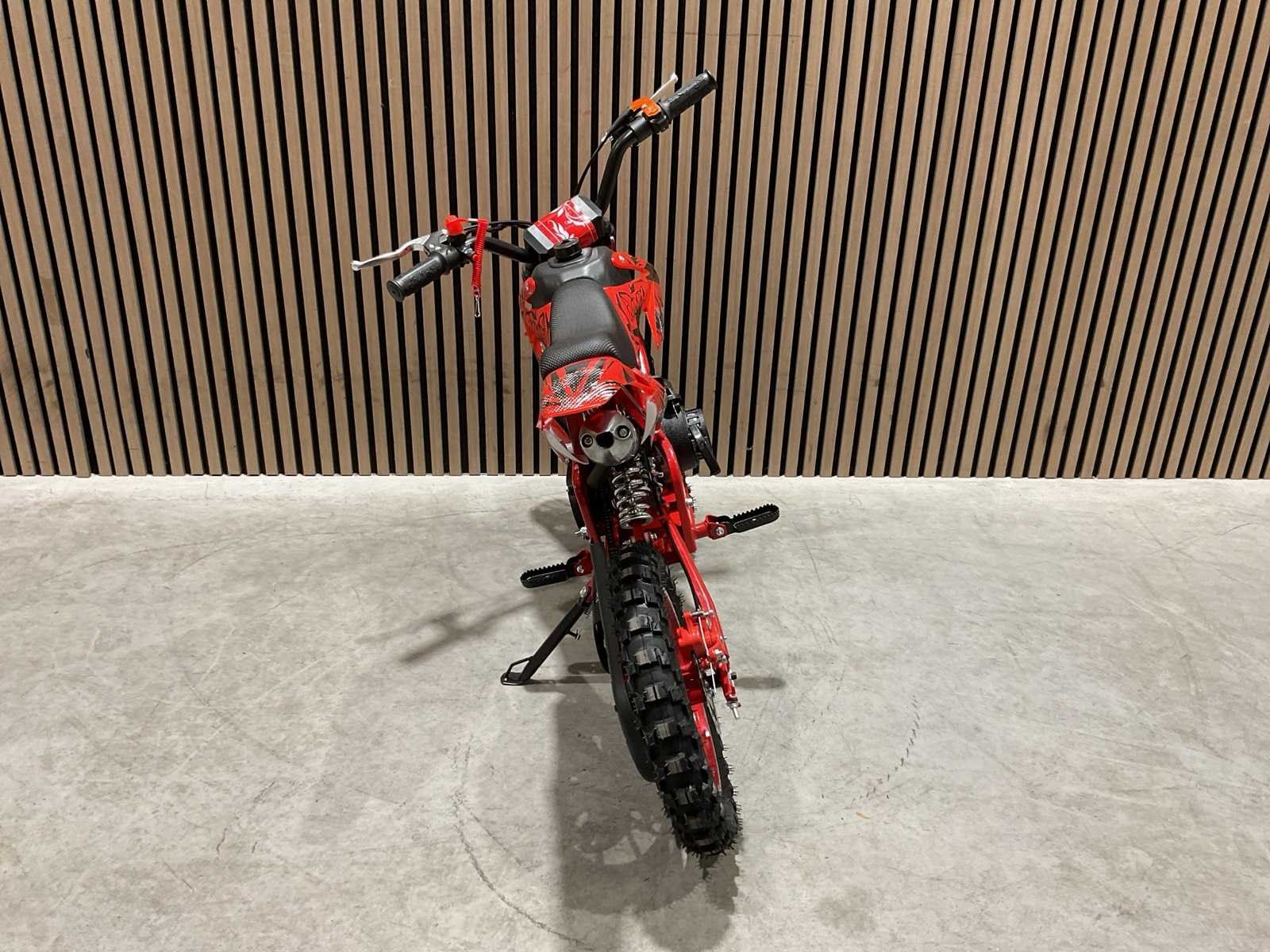 Voorzien van 49 cc, 2-takt benzinemotor luchtgekoeld; 3,5 pk; Trekstart; Transmissie: Automatische koppeling, kettingaandrijving; Mengsmering 2-takt; Top-snelheid: 40 km/u met snelheidsbegrenzers; Stalen buizenframe; Voor & achter schijfremmen; Voorvork + achter schokbrekers; Zithoogte: 55 CM; Max. laadvermogen: 60 kg; Gewicht: 22kg; Ongebruikt in doos (Transport 107x27.5x56cm, Gewicht 24kg) Merk: MMX Model: Dirt Bike 49cc Rood Type: TWHHPB-003 Brandstof: 2 takt Cilinderinhoud: 49cc Gewicht: 22kg Vermogen (kW): 3.5kW Kleur: Rood