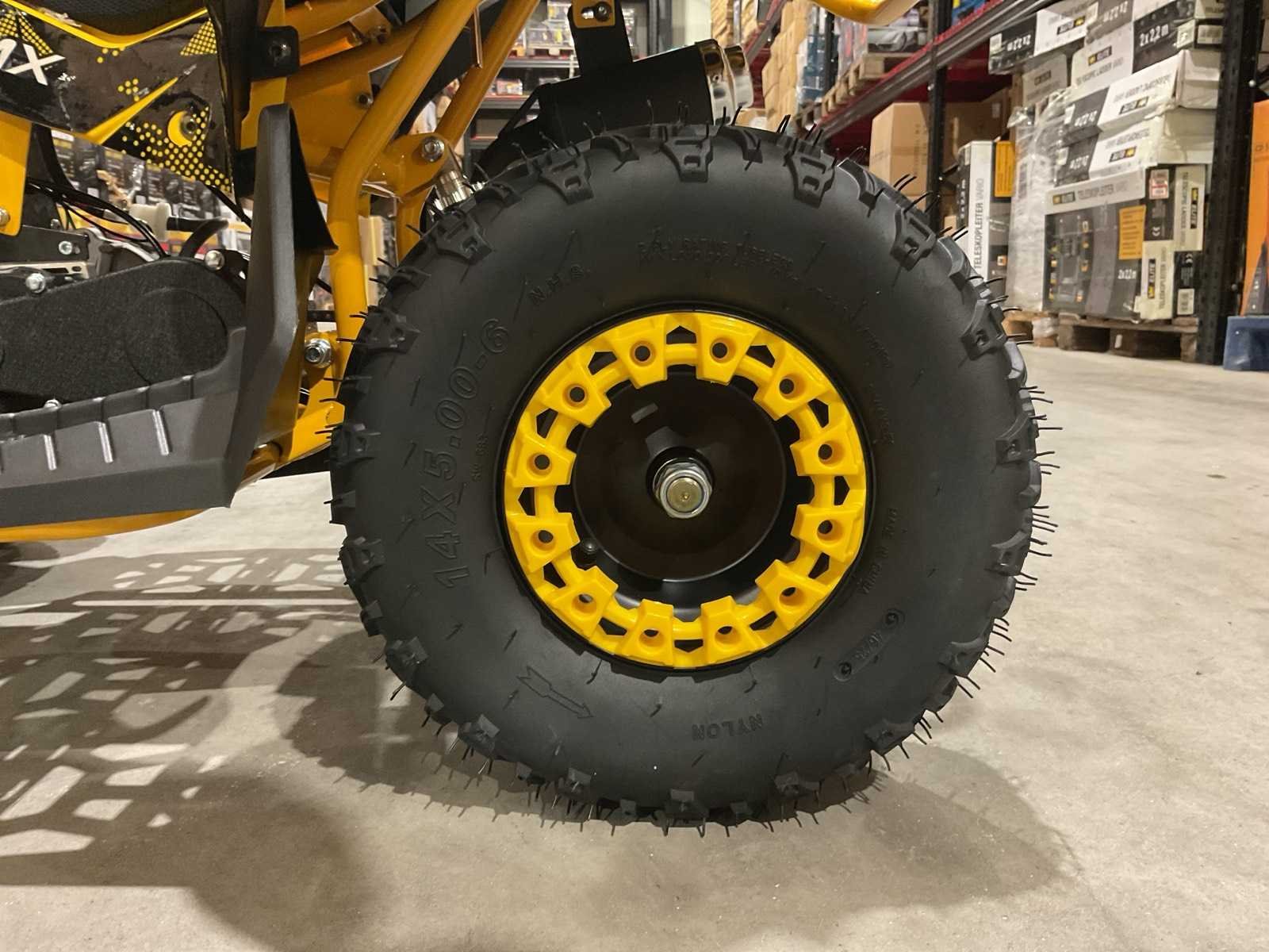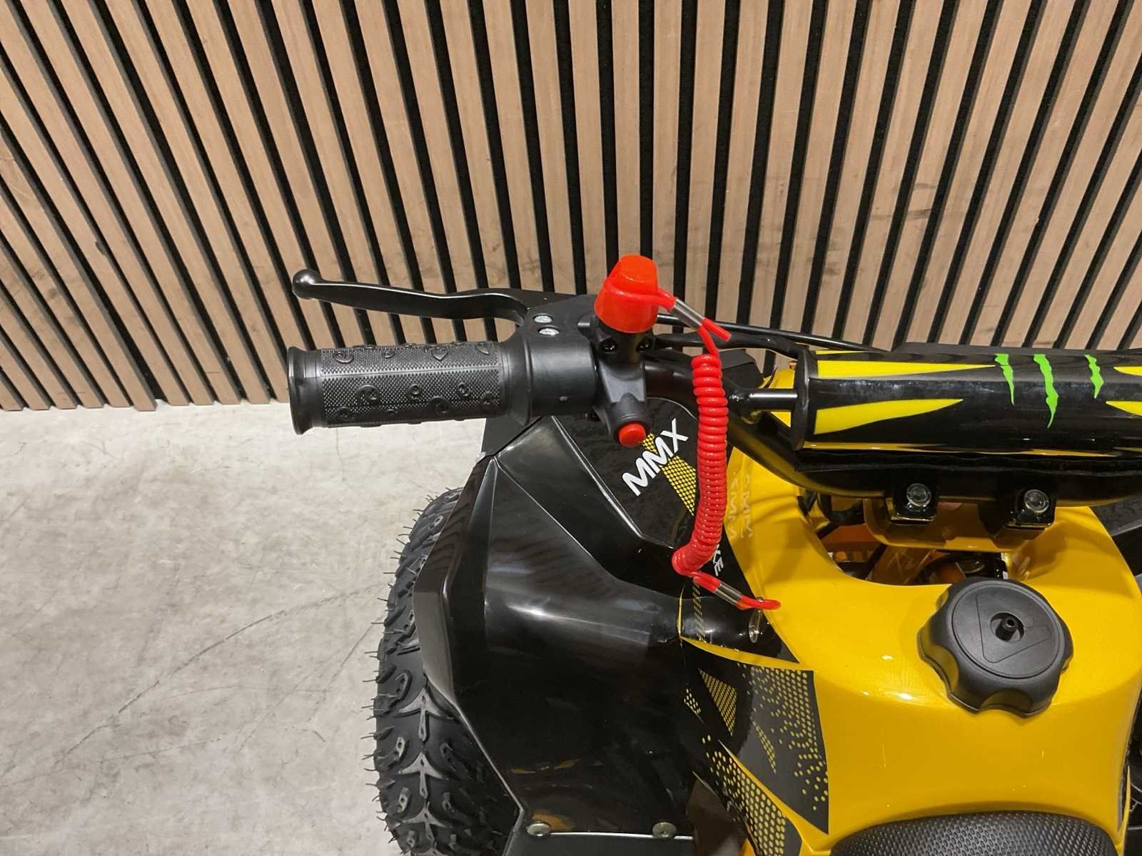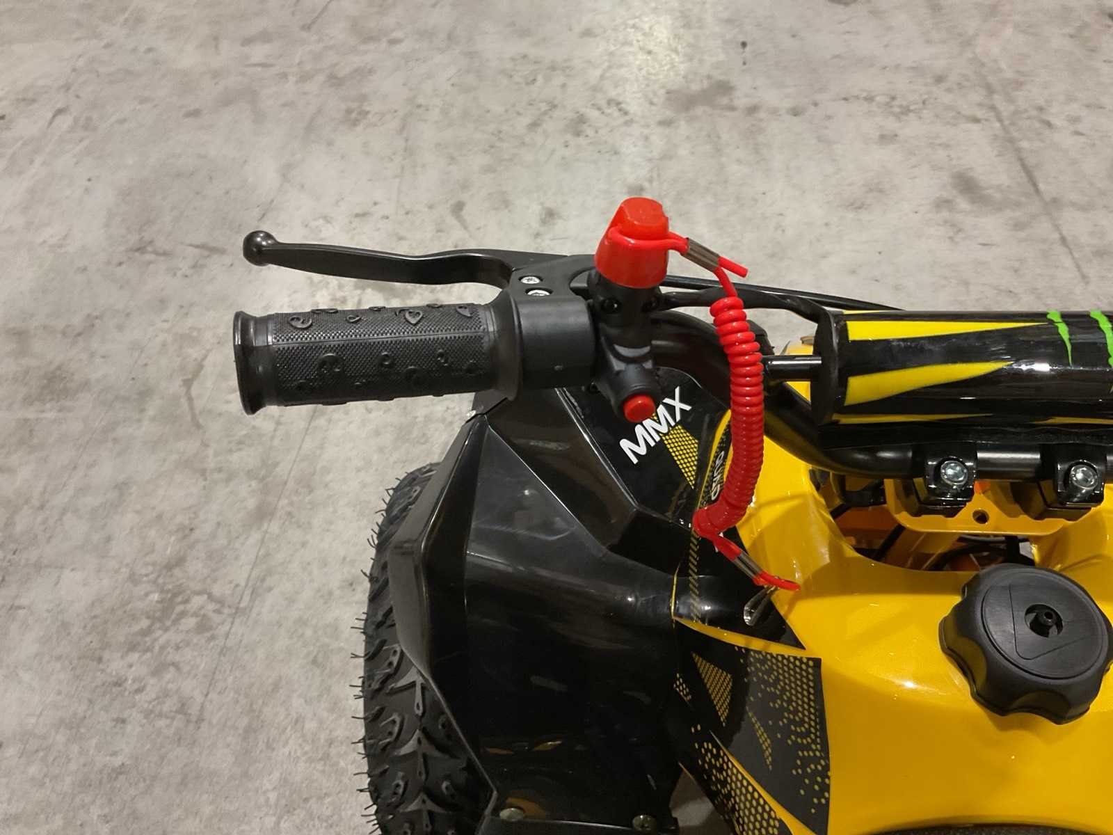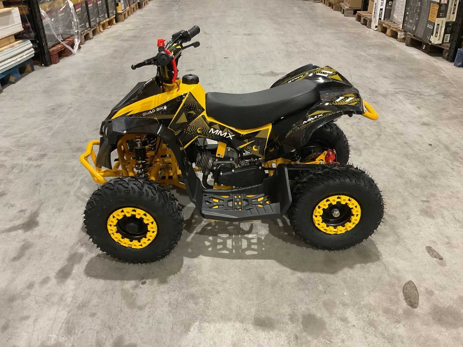 Voorzien van 49cc benzine motor; luchtgekoeld; trekstart; automaat; trekstart; schijfremmen; twee sleutels; Transport afmetingen: 105x62x52 cm; transport gewicht: 46kg; ongebruikt in doos Merk: MMX Model: TWHHATV-008 Product type: Geel Gewicht: 42kg Aantal sleutels: 2 Transmissie: Automaat Lengte: 120cm Breedte: 70cm Hoogte: 74cm