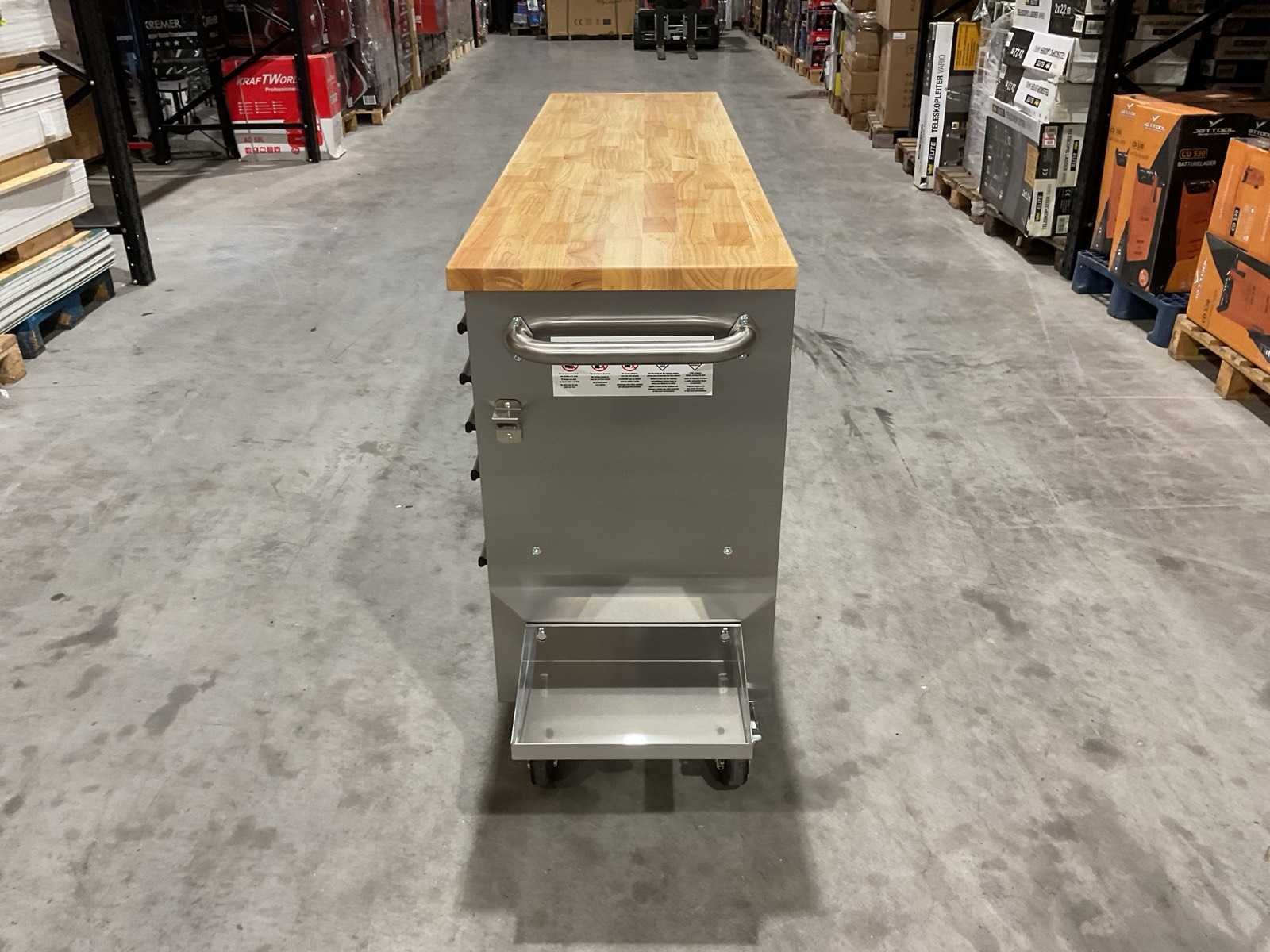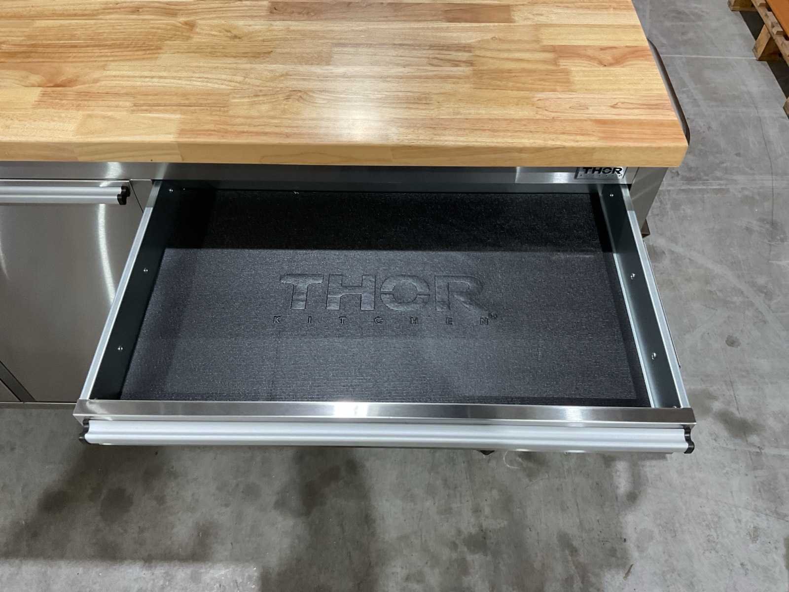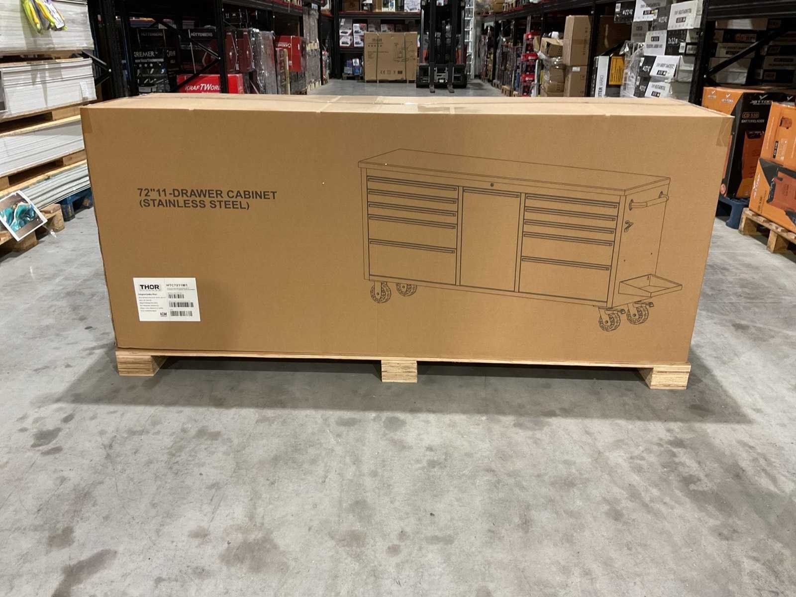 Voorzien van 11 laden; houten werkblad; centrale vergrendeling; heavy-duty zwenkwielen; ongebruikt Merk: Thor Model: HTC7211W1 Product type: 72” Kleur: RVS / Hout