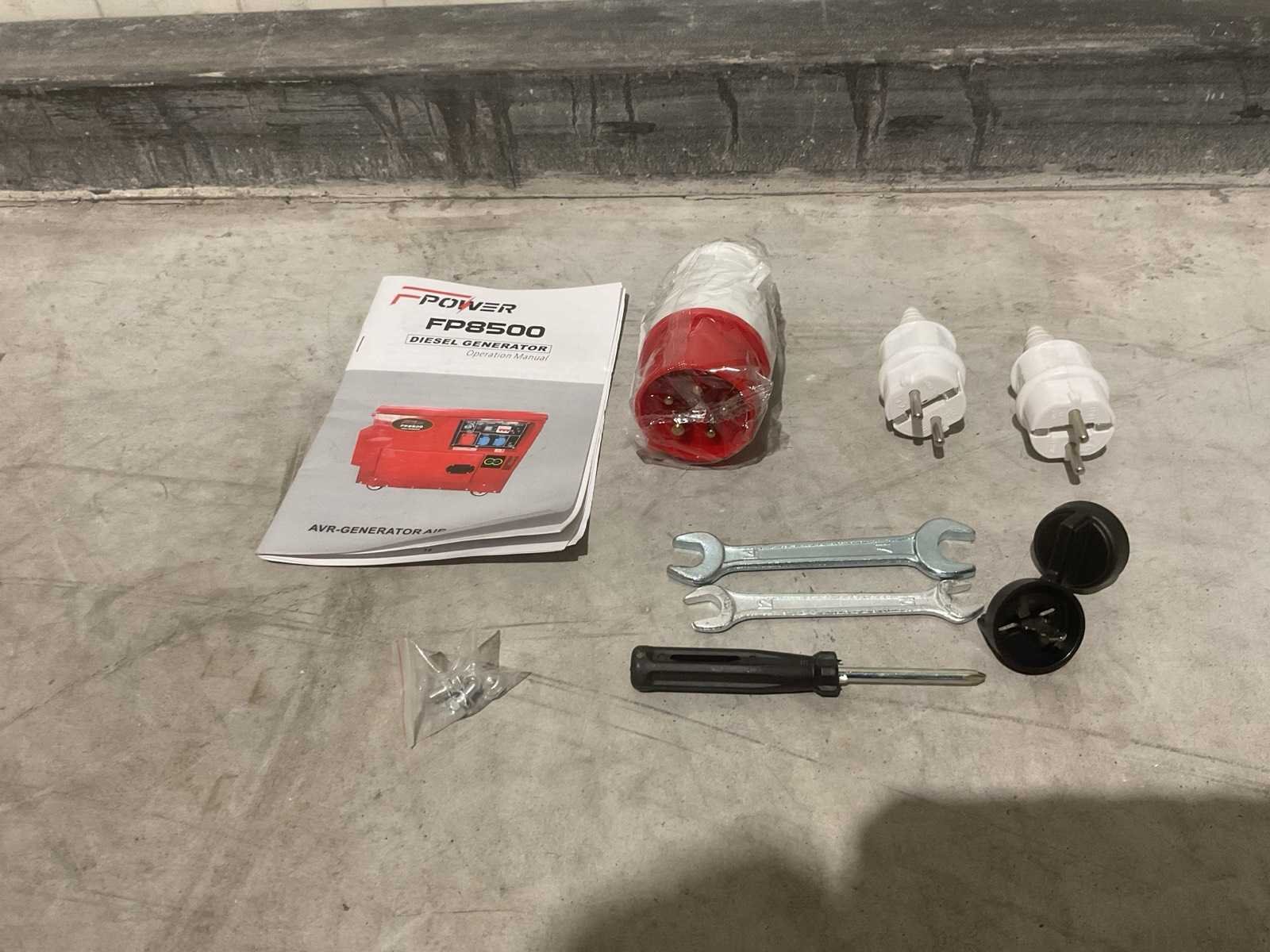 Voorzien van Frequentie: 50 Hz; Spanning: 220V / 380V (1-fase & 3-fase); Maximaal vermogen: 6,5 kW; Power factor: 1.0; Spanningsregeling: AVR (automatisch); Motortype: 4-takt dieselmotor; Koeling: Luchtgekoeld; Injectie: Directe diesel-injectie; Start: Elektrisch; Transport: 168 kg (91x54x63) cm; Ongebruikt Merk: Fpower Type: FP8500 Diesel: true