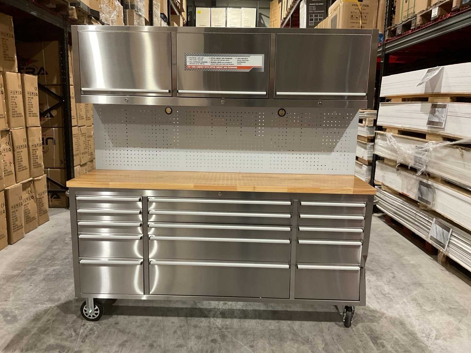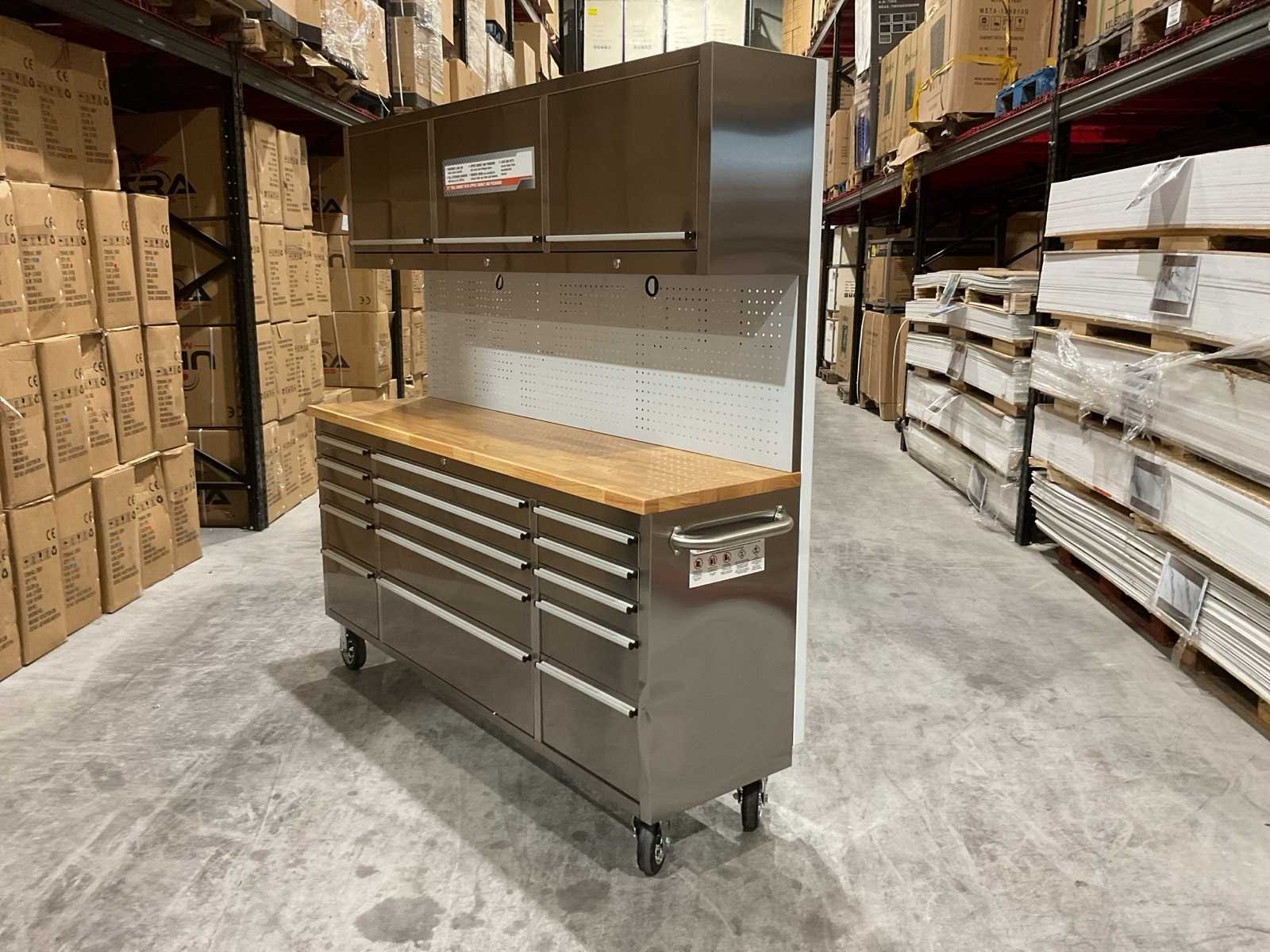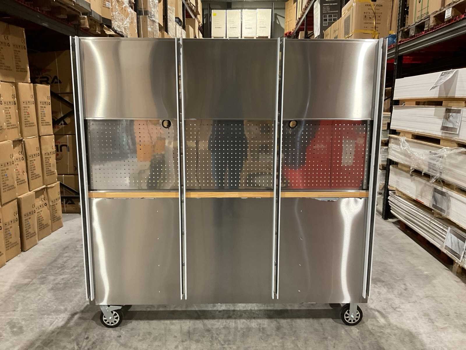 Voorzien van all 430 anti-fingerprint stainless steel; 15 laden; 3 hoge kasten; achterwand; 35 mm houten werkblad; 2 handvaten; 4 x 6 inch wielen waarvan 2 wielen met rem; afsluitbaar door middel van sleutel; ongebruikt in doos (transport afmetingen 190x55x130 cm) Transportschade Merk: Stahlworks Model: Deluxe RVS 72 inch high Product type: 15 laden 191345 Gewicht: 179kg Lengte: 1830mm Hoogte: 1870mm Materiaal: RVS