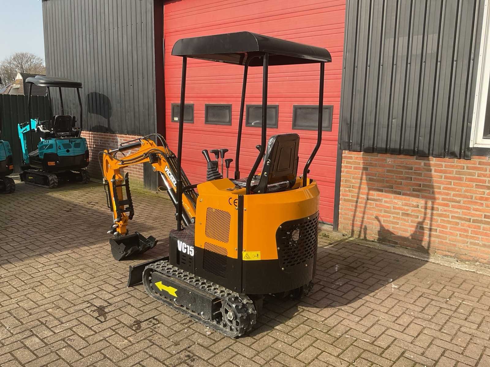Voorzien van rupsaandrijving; Diesel motor; Bedrijfsgewicht: 1.500 kg; 2500x950x2200 mm LxBxH; Rubber tracks: 180 mm breed; Graafbak: 400 mm; 360° rotatie; Joystick / servo bediening; Werkverlichting; Elektronisch display; Ongebruikt Merk: Vicsec Type: VC15D Geel