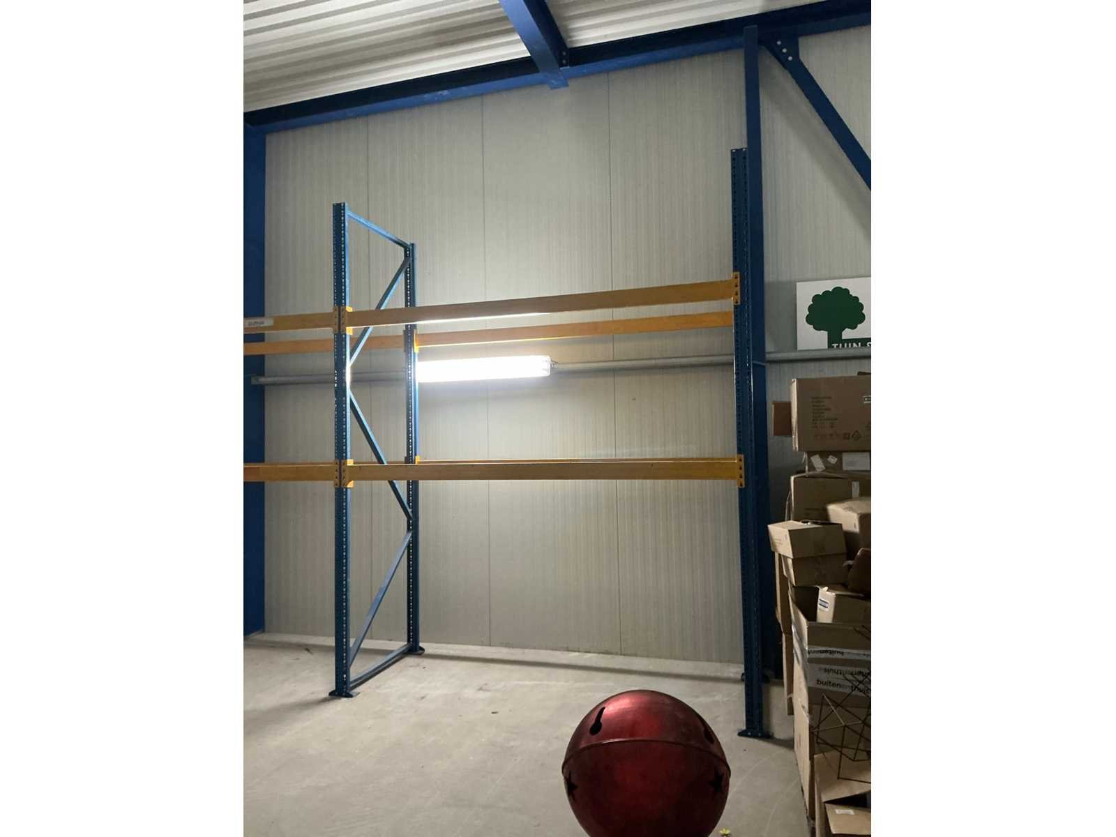 14 houten platen. Let op deze kavel moet professioneel gedemonteerd worden. Aantal secties: 4 Sectie afm. b: 2700mm Sectie diepte: 1100mm Sectie afm. h: 3500mm Aantal staanders: 5 Aantal liggers: 16