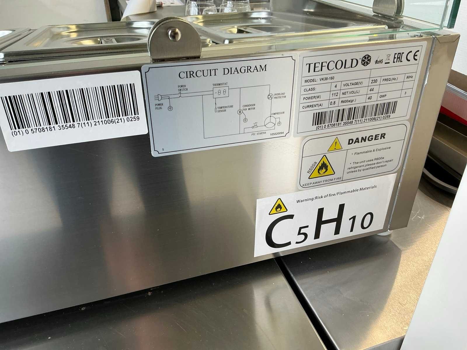 1x TEFCOLD GEKOELDE OPZETVITRINE VK38-150-1 Artikelnummer: 93805710/20007500 Afmeting: 1500 x 395 x 225 mm (bxdxh) Aansluitspanning: 230 V/ 112 W Capaciteit: 6x 1/3GN Temp. bereik: +2°C tot +10°C Uitvoering: Roestvrij staal Statische koeling Elektronische thermostaat Handmatig ontdooiing Glazen structuur voor bescherming van voedsel Verstelbare poten Let op! Dient professioneel gedemonteerd te worden en exclusief inhoud.