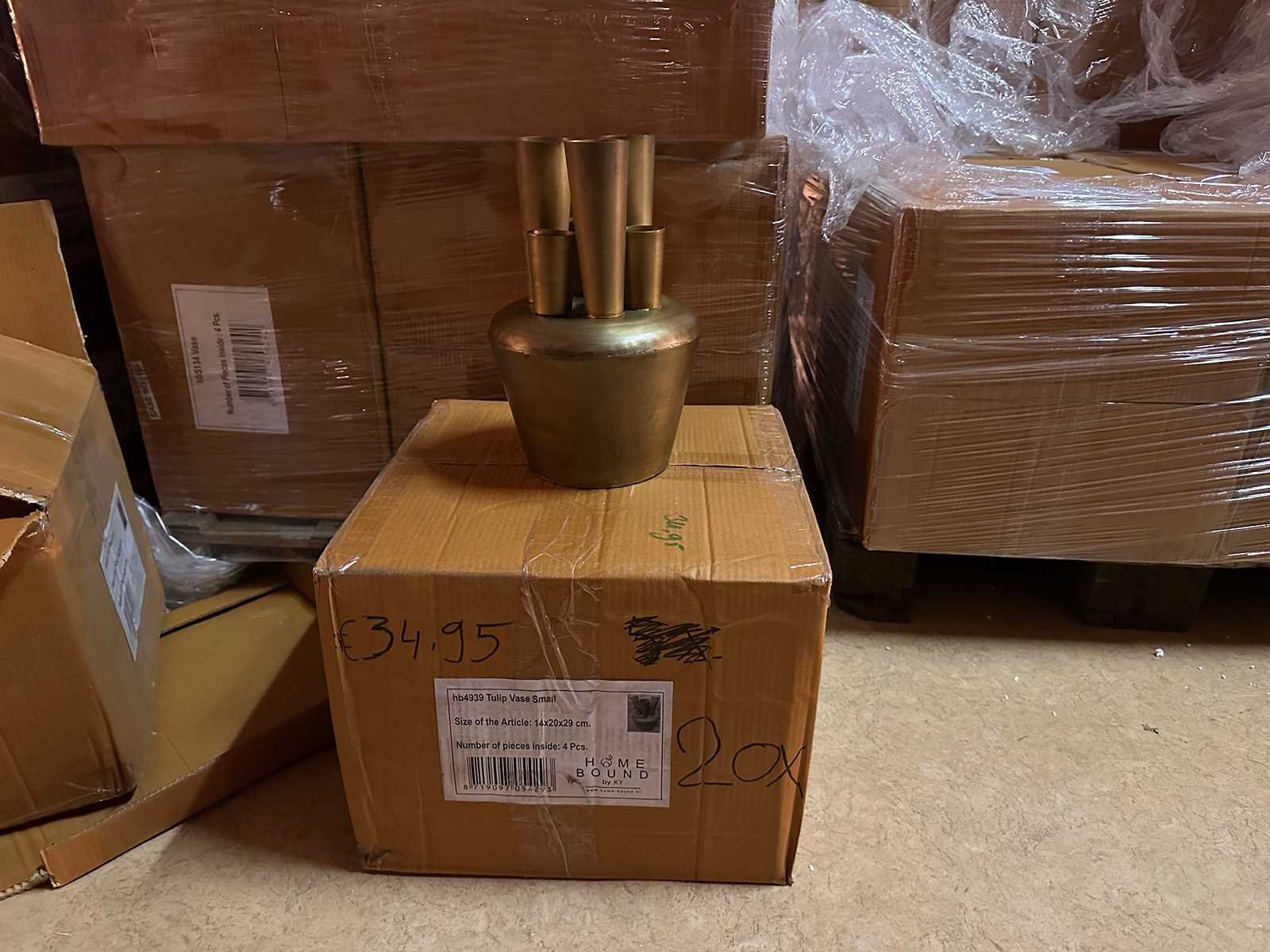 96x €8,95 hb4902 big deer with batti 10x €14,95 hb4998 round mirror 6x €49,95 hb4777 ceilling lamp 20x €34,95 hb4939 Tulip vase small 40x €74,95 hc3572 wandhanger kraanvogel Winkelwaarde totaal €5.000,- Bestaande uit: 172 artikelen