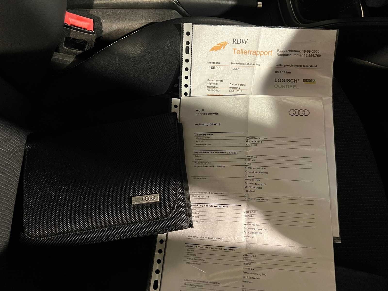 Kenteken: 1-SBP-86 Merk: Audi Model: A1 Type: 1.2 TFSI Pro Line S Bouwjaar: 2013 Afgelezen kilometerstand: 172722km Cilinderinhoud: 1197cc Vermogen (kW): 63kW Brandstof: Benzine Chassisnummer: WAUZZZ8X4EB021719 NAP status: Logical Datum eerste toelating: 2013-11-08 APK vervaldatum: 2026-11-15 Vermogen (pk): 84hp Aandrijving: voorwiel Aantal zitplaatsen: 4 Maximaal trekgewicht ongeremd: 1000kg Maximaal trekgewicht geremd: 550kg Kleur: grijs Transmissie: Handgeschakeld (5) Stuurwiel: links Emissieklasse: 5 Aantal deuren: 2 Aantal sleutels: 2 Ledig gewicht: 1015kg Bruto BPM (NL): 2875€ Rest BPM: 356€ Aantal cilinders: 4 Carrosserie: Stationwagen Onderhoudshistorie: volledig ingevuld Carfax Link: https://was.carfax.eu/v0/api/ccdid/5100016408/svc/201/vinreg/1SBP86/checksum/eyJhbGciOiJIUzI1NiIsInR5cCI6IkpXVCJ9.eyJleHAiOjE3NzgyMzQzMzB9.OsiQEBq2Cp15AkYCkoo7le0sXbWUQUUYCTmPO5j9-Pc